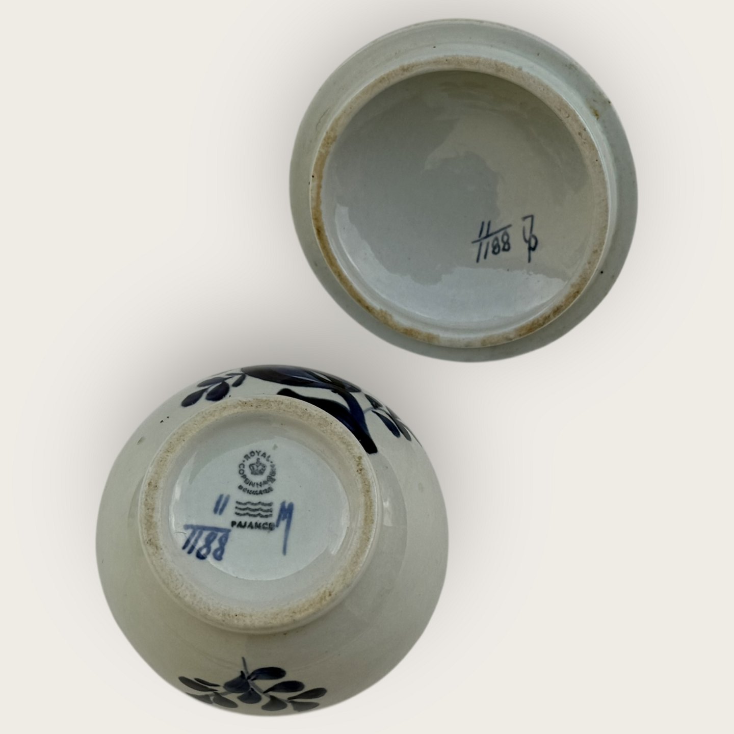 Beskrivelse: Royal Copenhagen, Trankebar, Sukkerskål med låg #11/1188, Højde 8cm, 7,5cm i diameter, 1. sortering, Design Christian Joachim *Pæn stand*