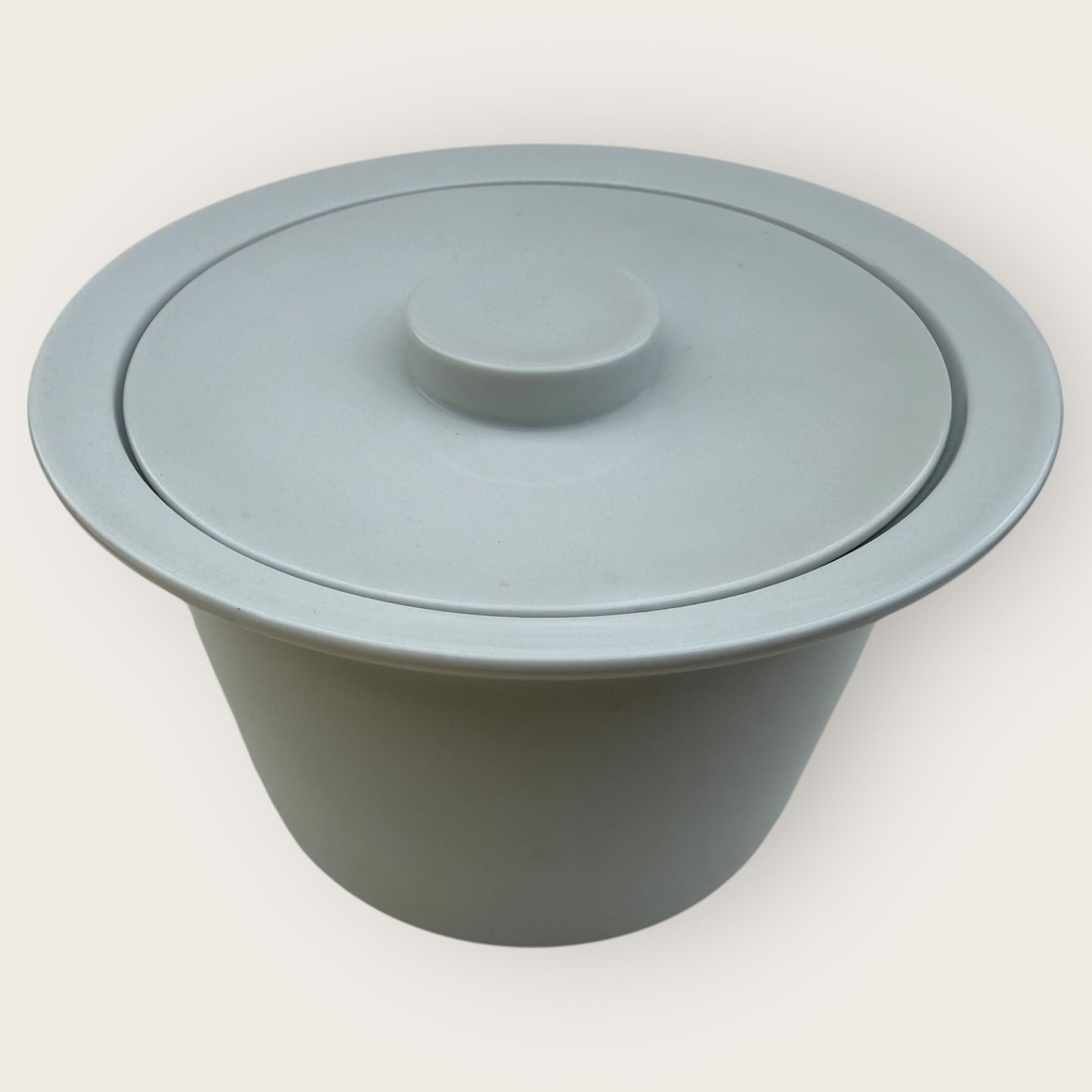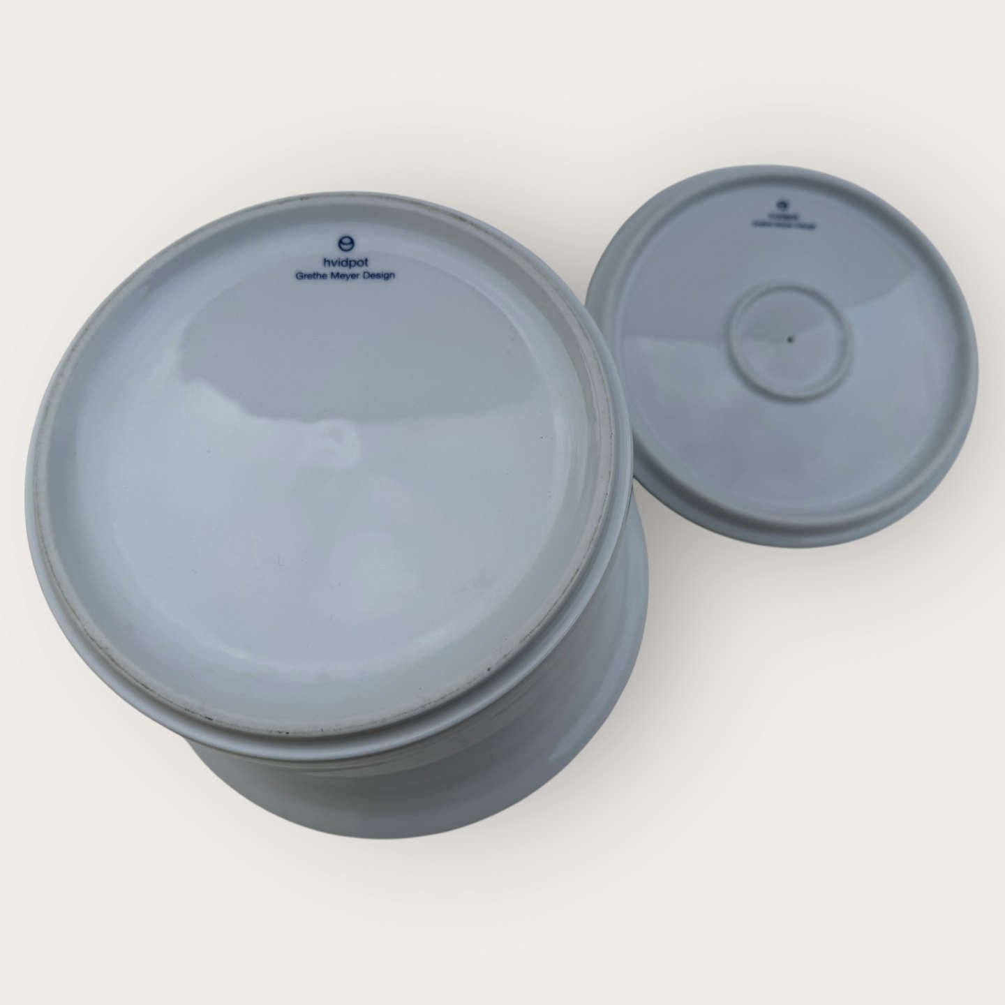 Beskrivelse: Hvidpot, Royal Copenhagen og COOP, Stor skål med låg, 22cm i diameter, 14,5cm høj, 1.sortering, Design Grethe Meyer *Perfekt stand*
