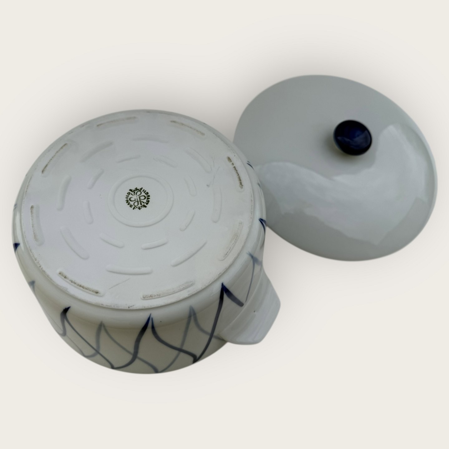 Description: Lyngby, Danild 40, Blue flame, Pot with lid and handle, diameter 20.5cm, 25 cm wide with handle, 10.5cm high, 1st grade, Design Axel Brüel & Egon Mortensen *Good condition*