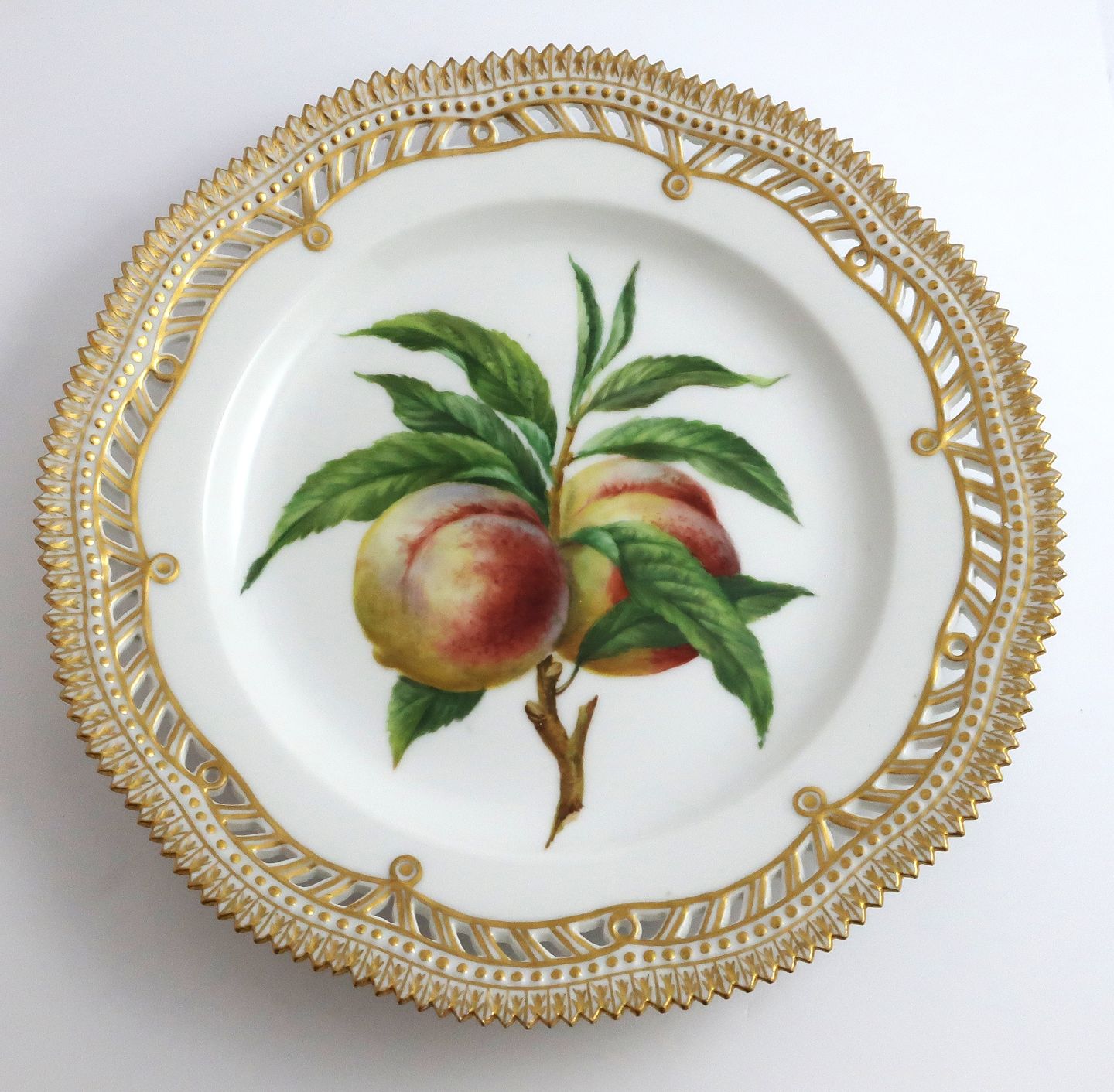 Royal Copenhagen, Flora Danica, frugttallerken. Frokost tallerken med gennemskåret bort. Design #429/3554. Diameter 23 cm. (1 sortering).