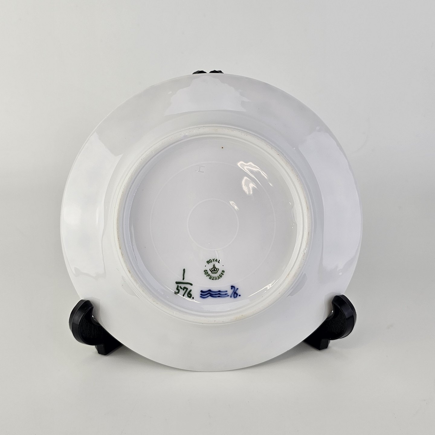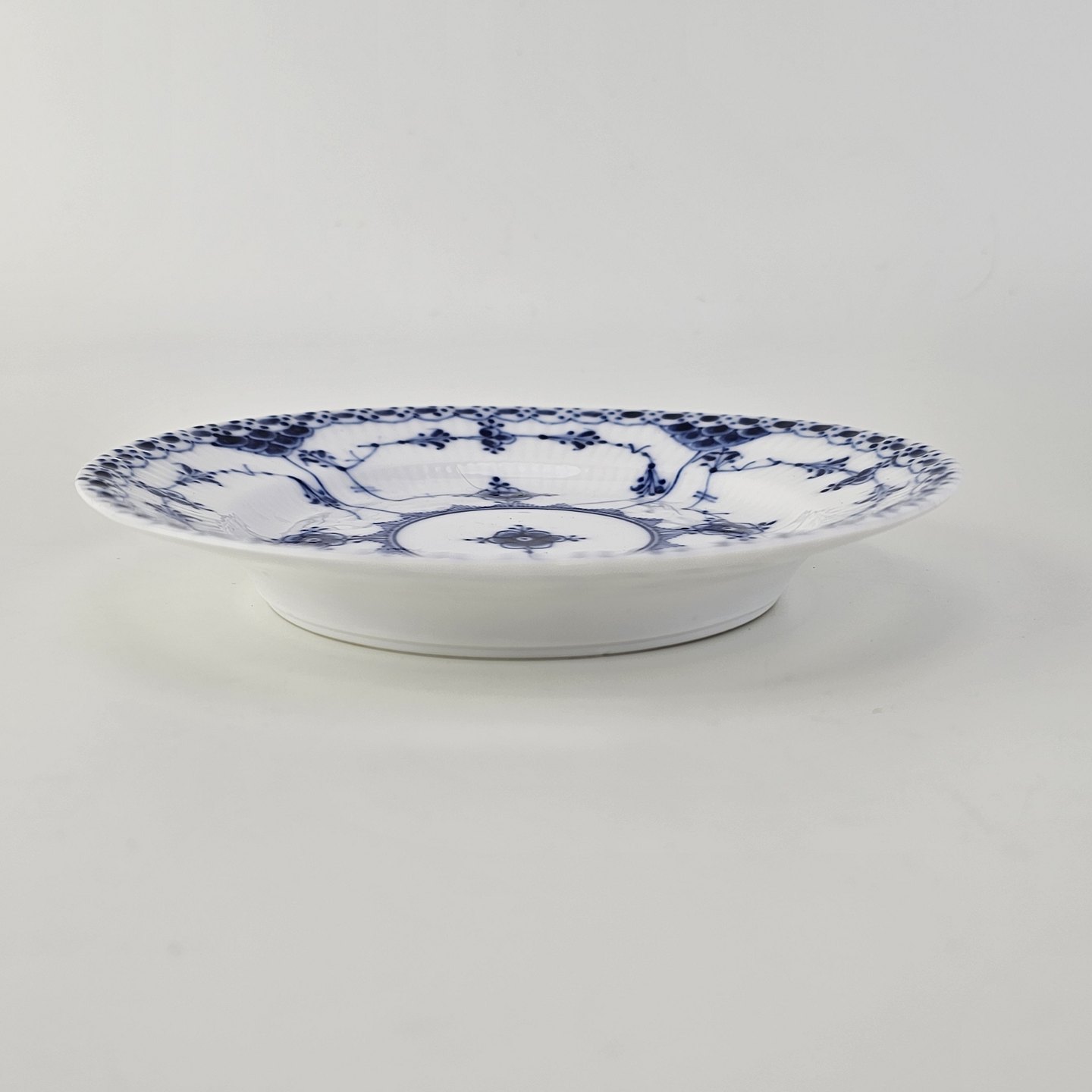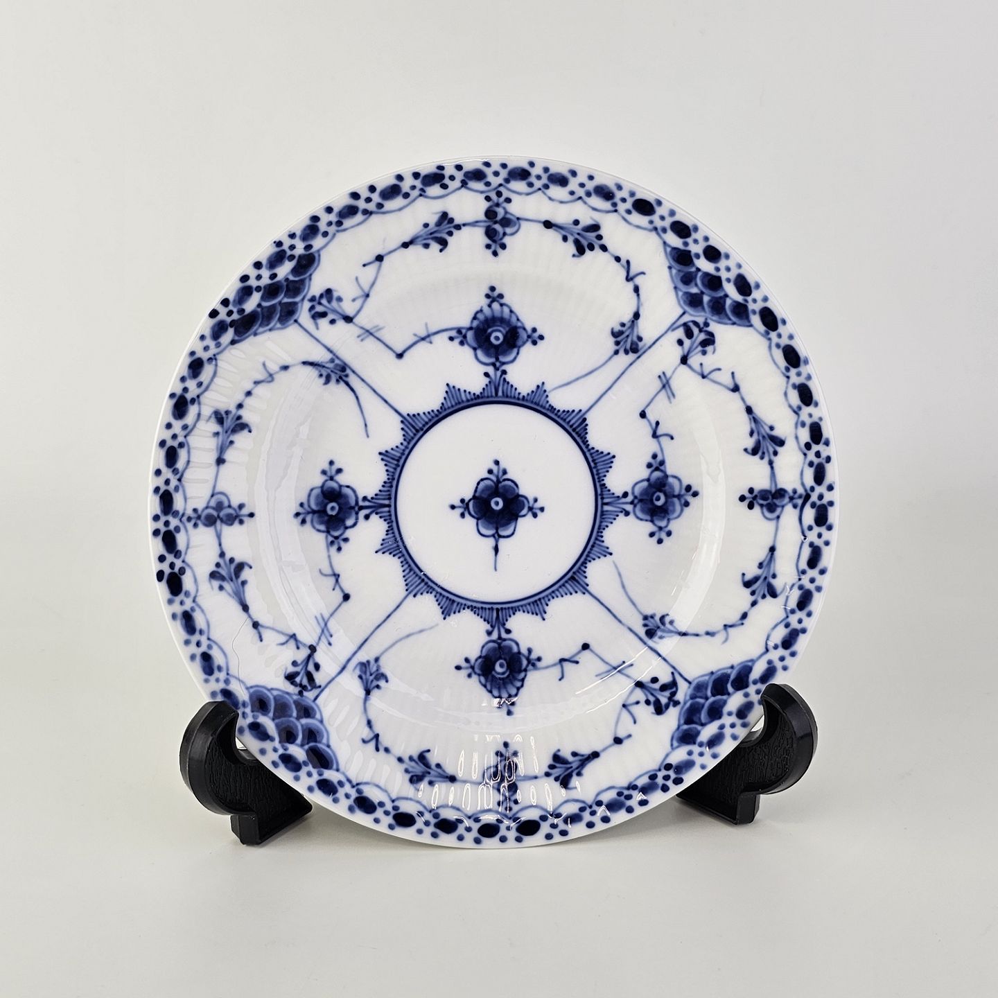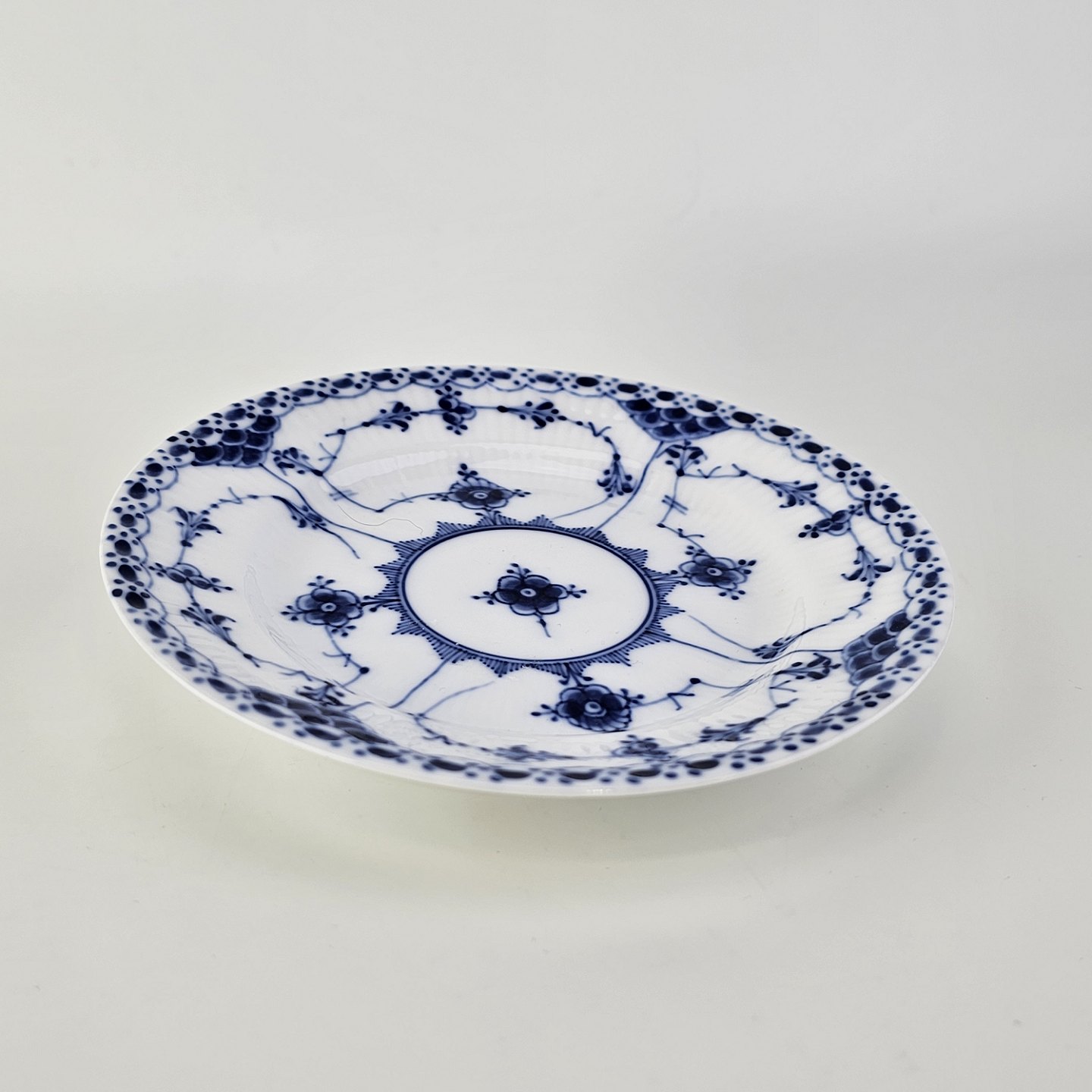 Beskrivelse: Flad sidetallerken i kongeligt porcelæn fra stellet Musselmalet Halvblonde