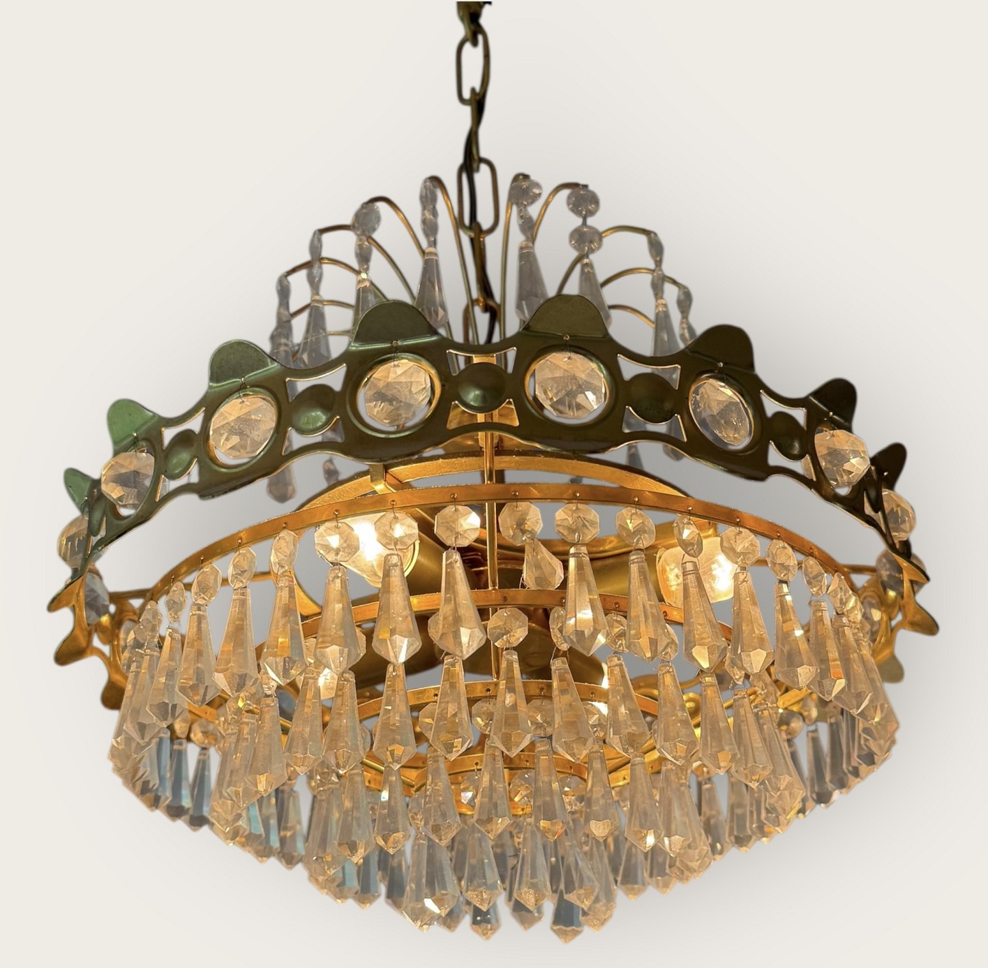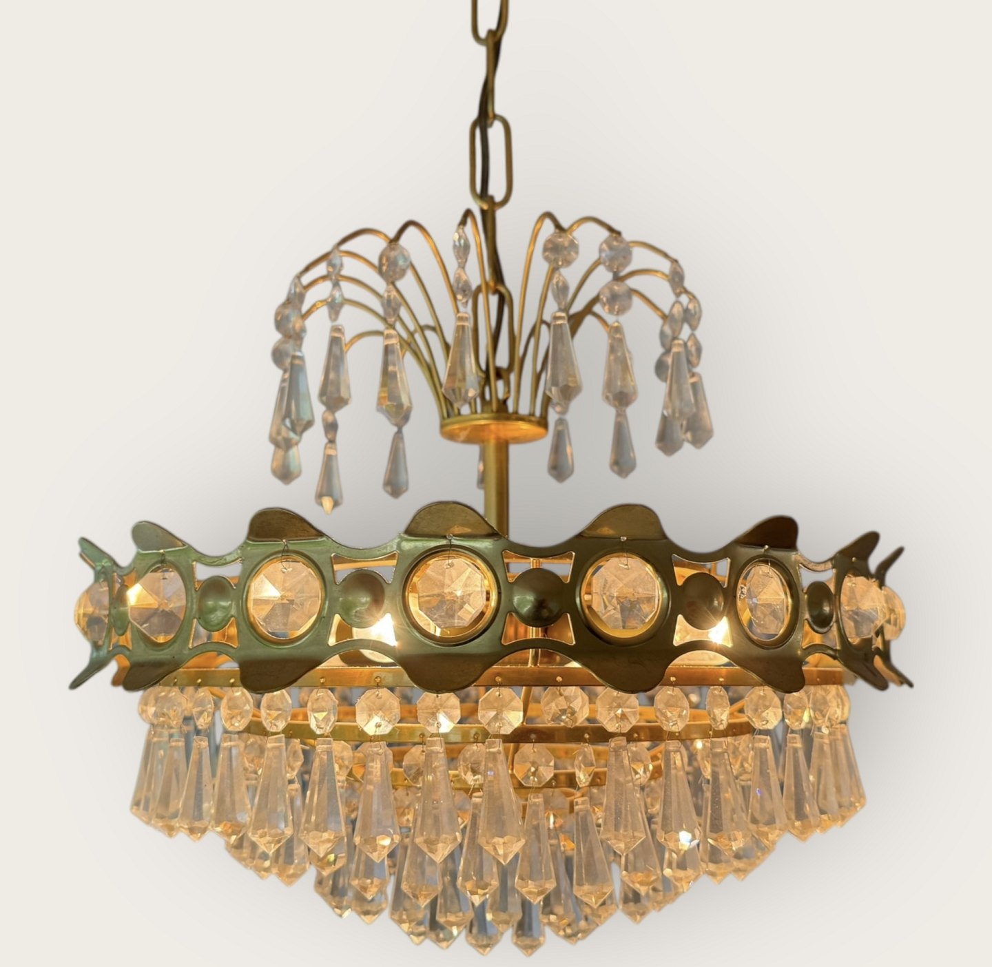Beskrivelse: Lysekrone i messing med mange glasprismer, fungere fint og med alle prismer, Diameter ca. 36cm *Pæn brugt stand*