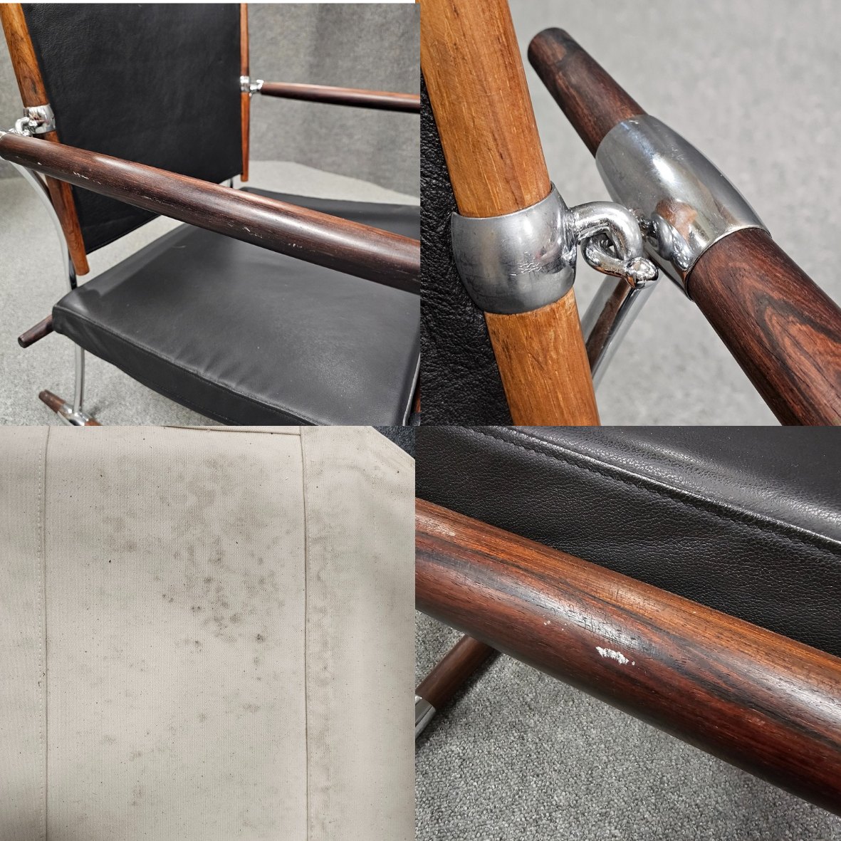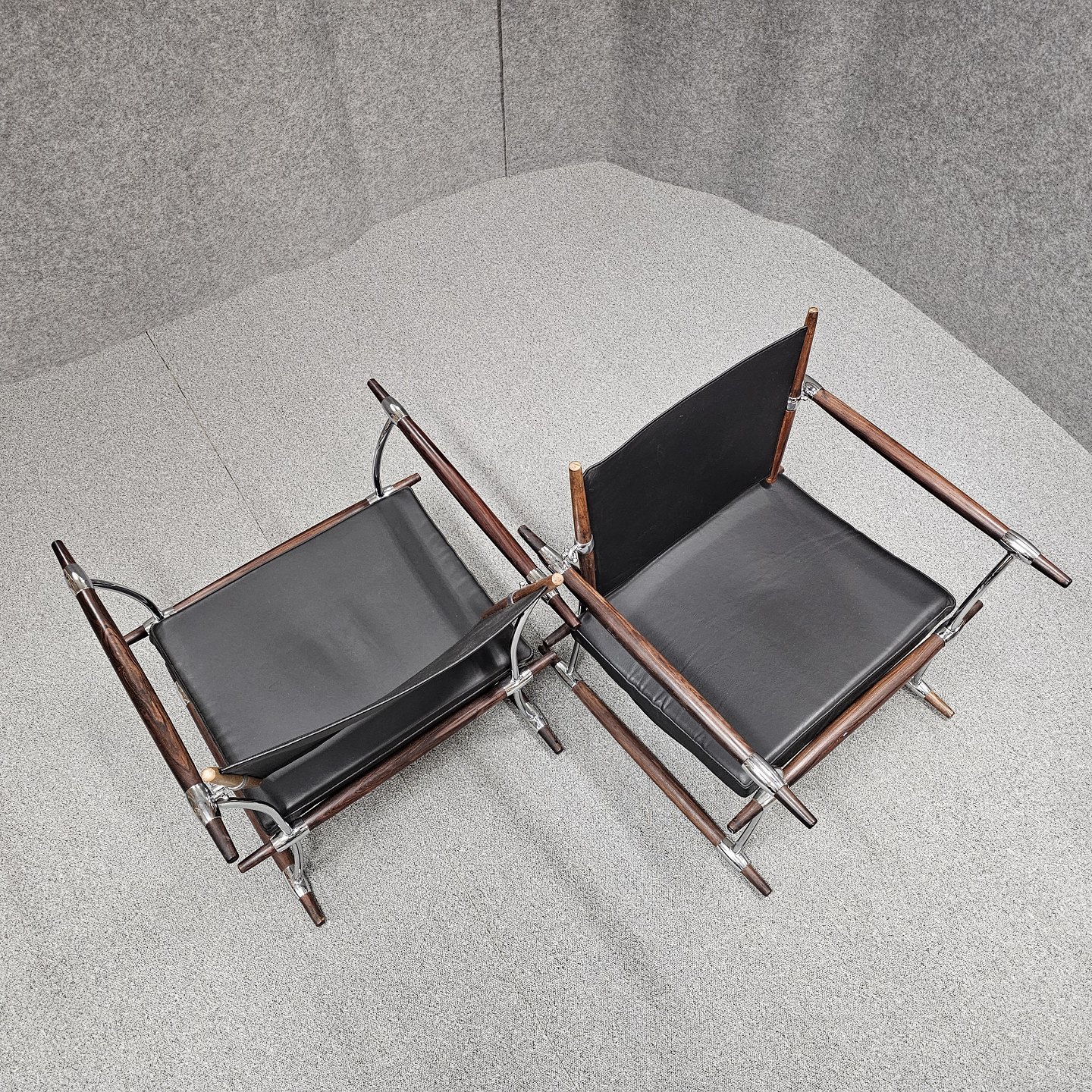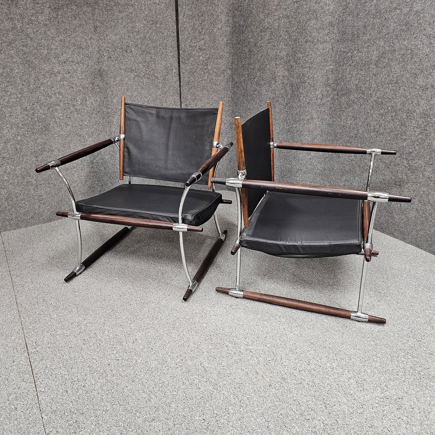 Beskrivelse: Sæt af to stokkestole med stel i palisander og forkromet stål og sæde af sort læder.