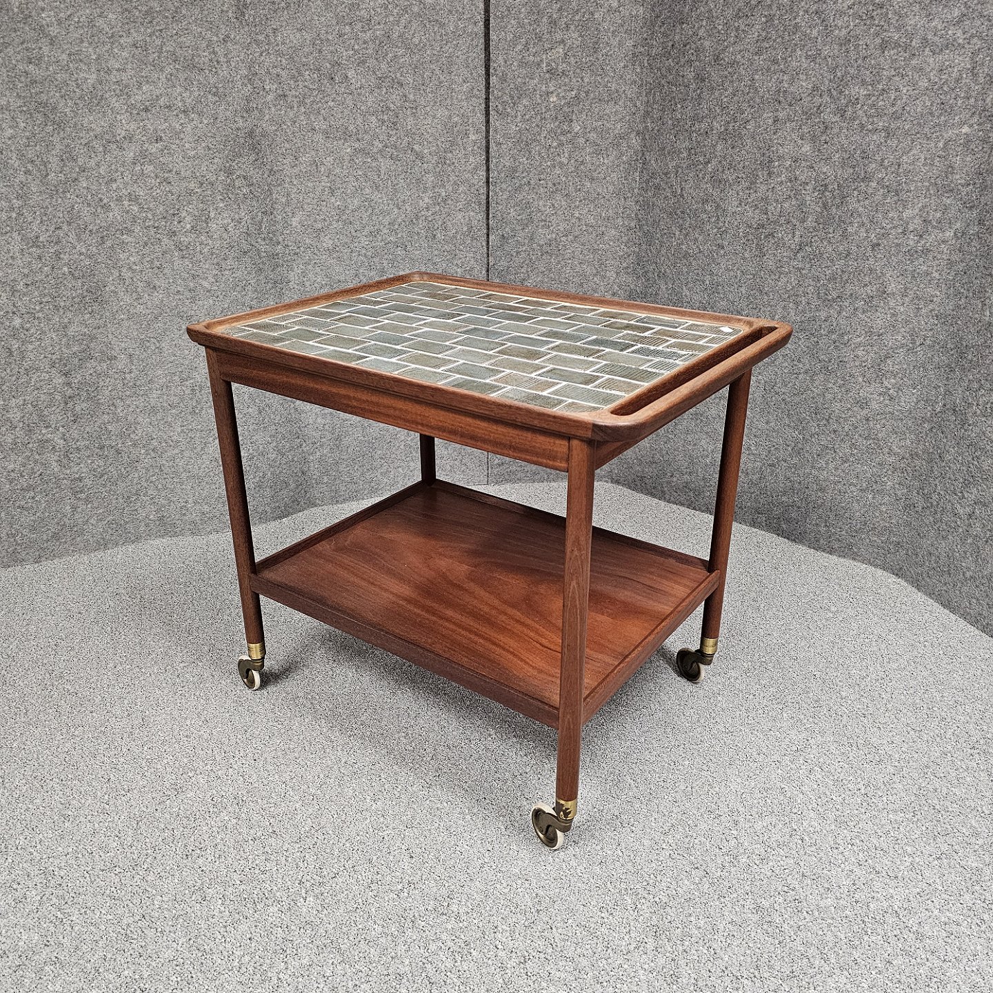 Beskrivelse: Rullebord i teak dekoreret med kakler i grønlige nuancer
