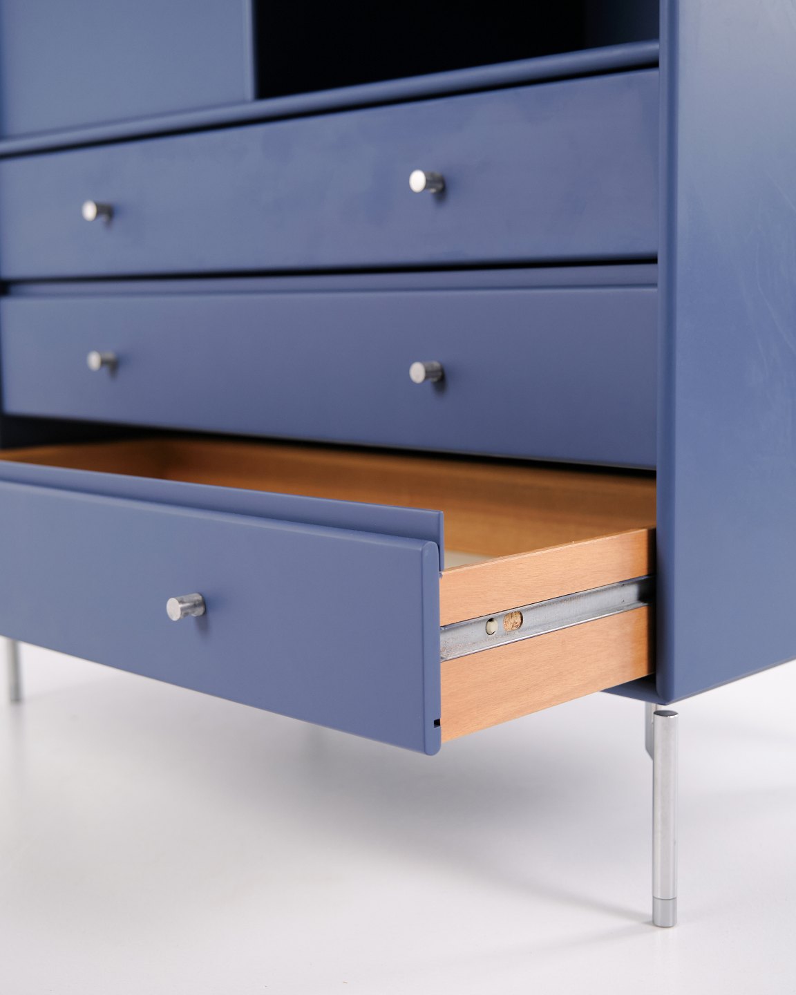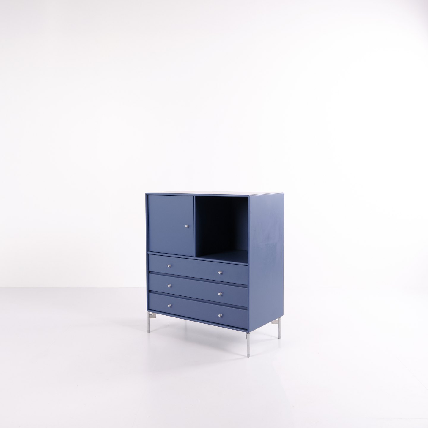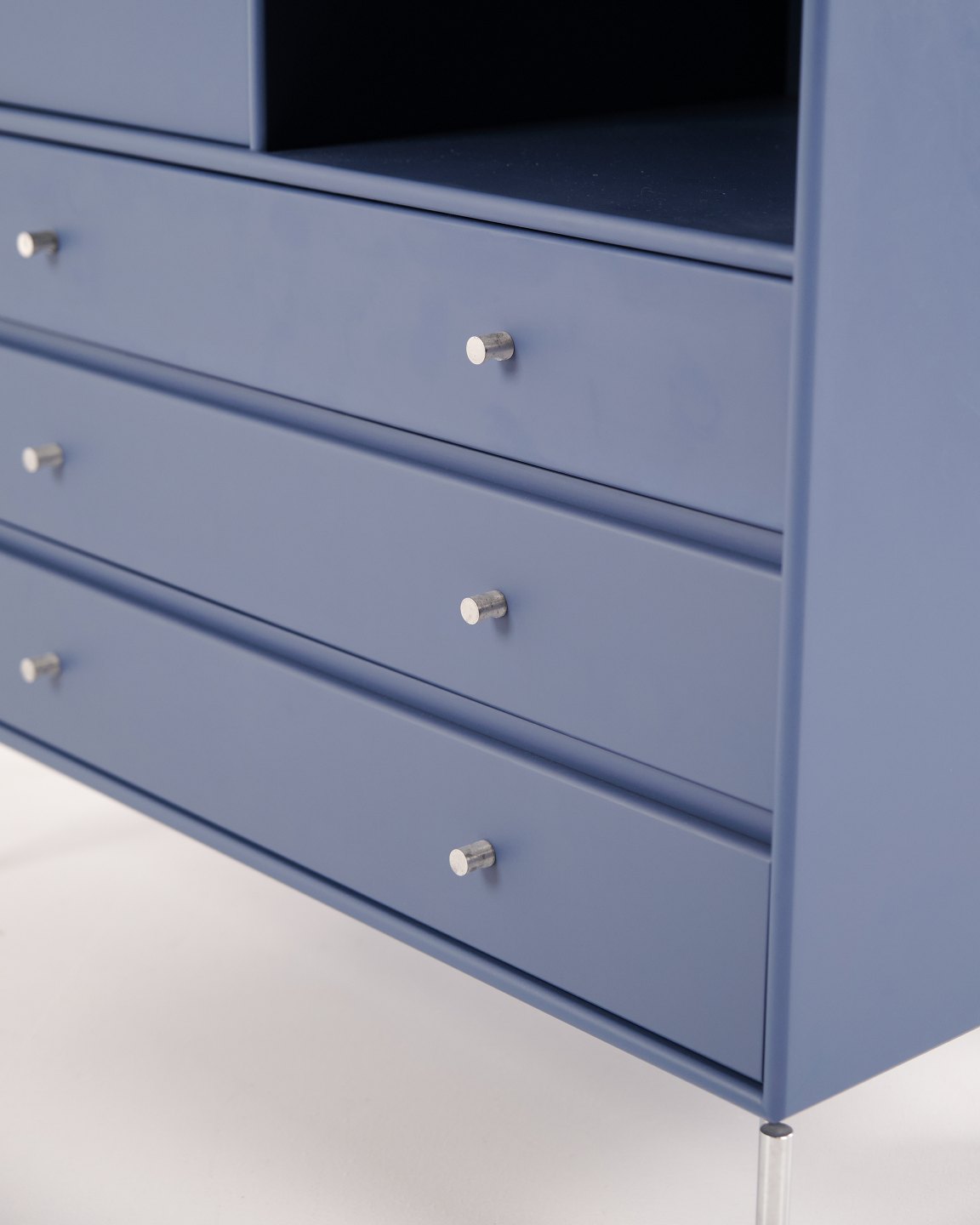 Beskrivelse: Montana kommode i blå med krom ben. Modulet er indrettet med tre skuffer og én låge, hvilket giver praktisk og fleksibel opbevaring. Et klassisk Montana-design med enkel struktur og høj funktionalitet.