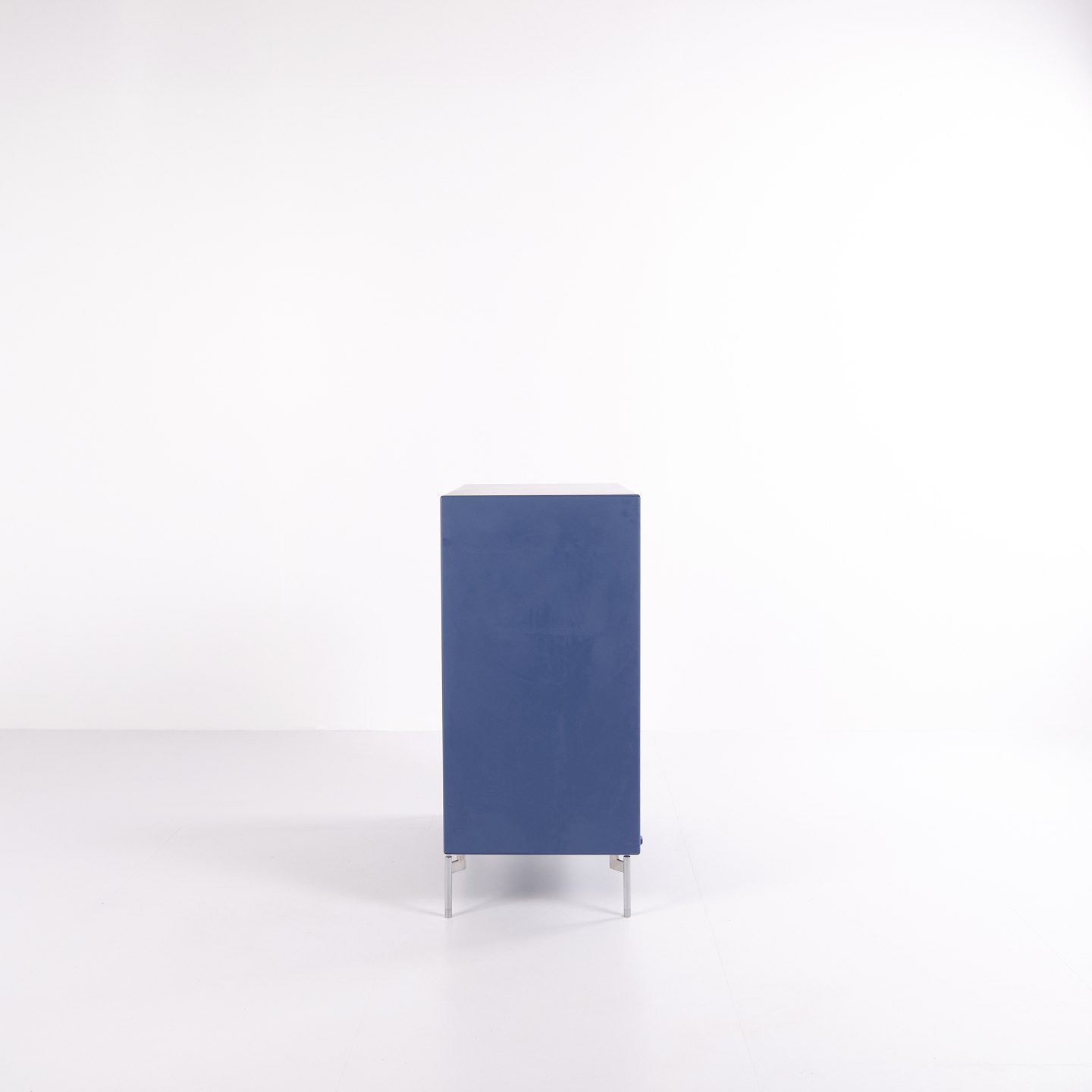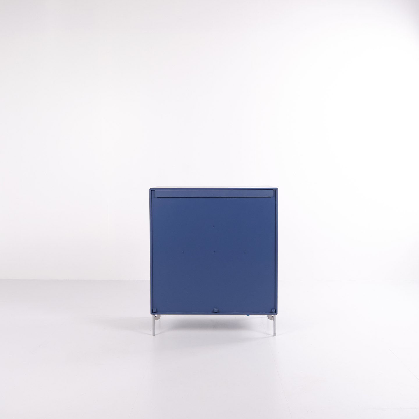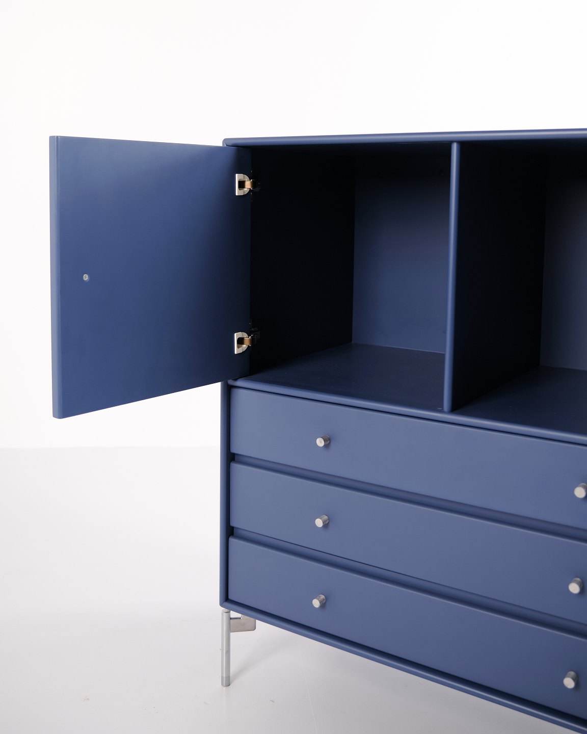 Beskrivelse: Montana kommode i blå med krom ben. Modulet er indrettet med tre skuffer og én låge, hvilket giver praktisk og fleksibel opbevaring. Et klassisk Montana-design med enkel struktur og høj funktionalitet.