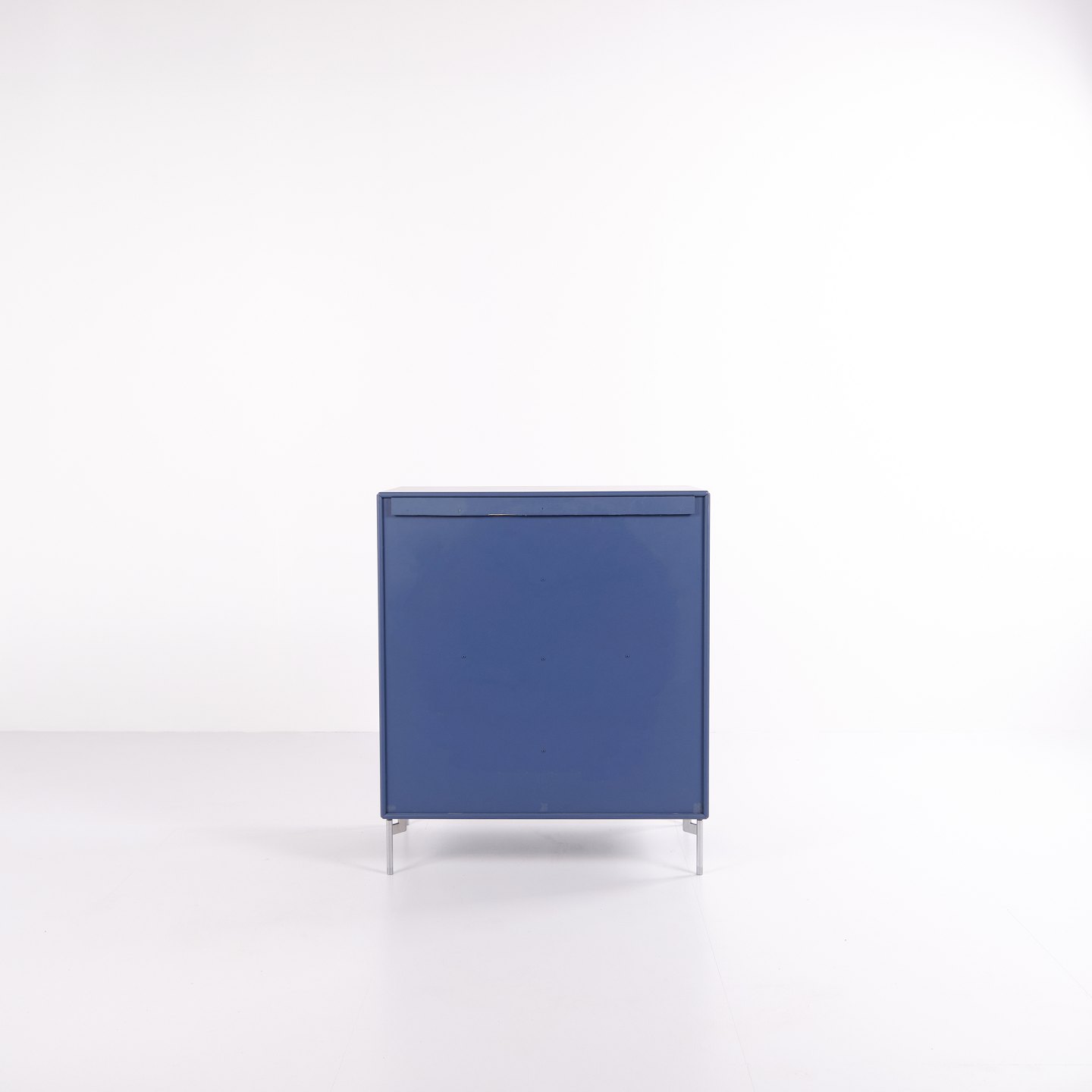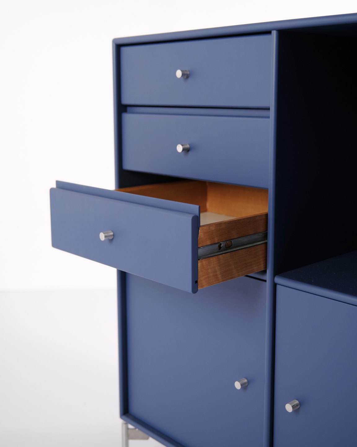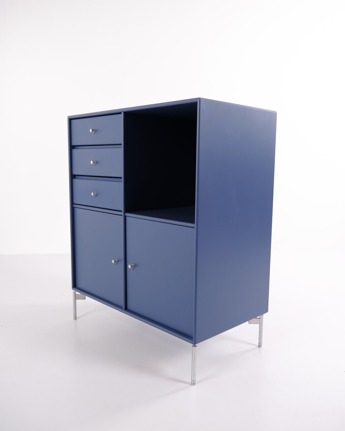 Beskrivelse: Montana kommode i blå med krom ben. Modulet er indrettet med tre skuffer og to låger, hvilket giver god og fleksibel opbevaringsplads. Klassisk Montana-design med enkel struktur og høj funktionalitet.