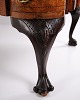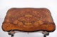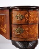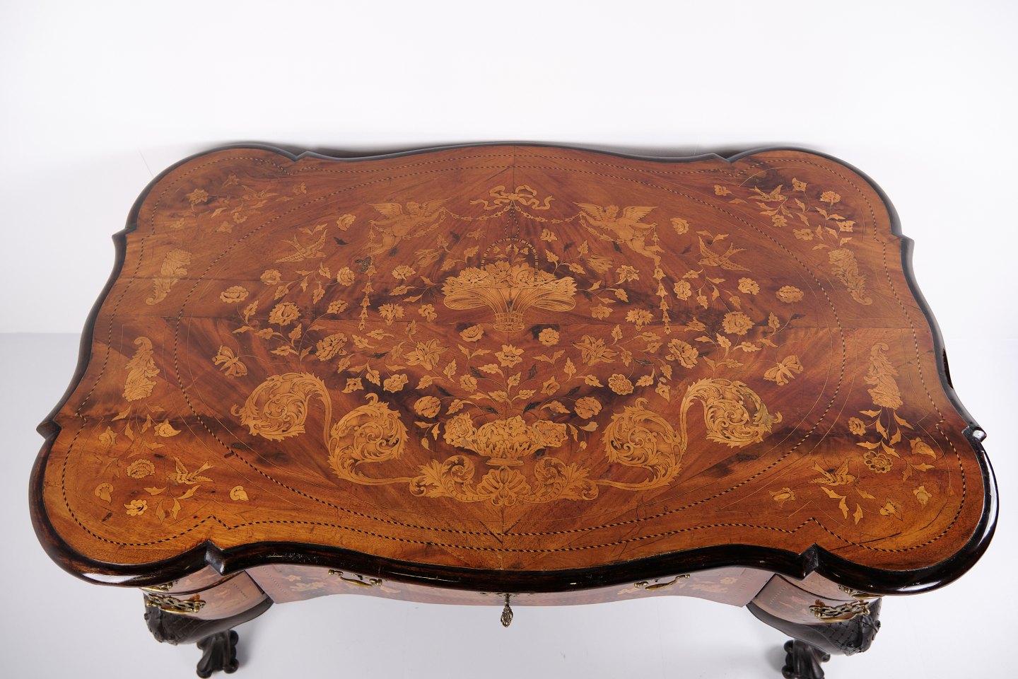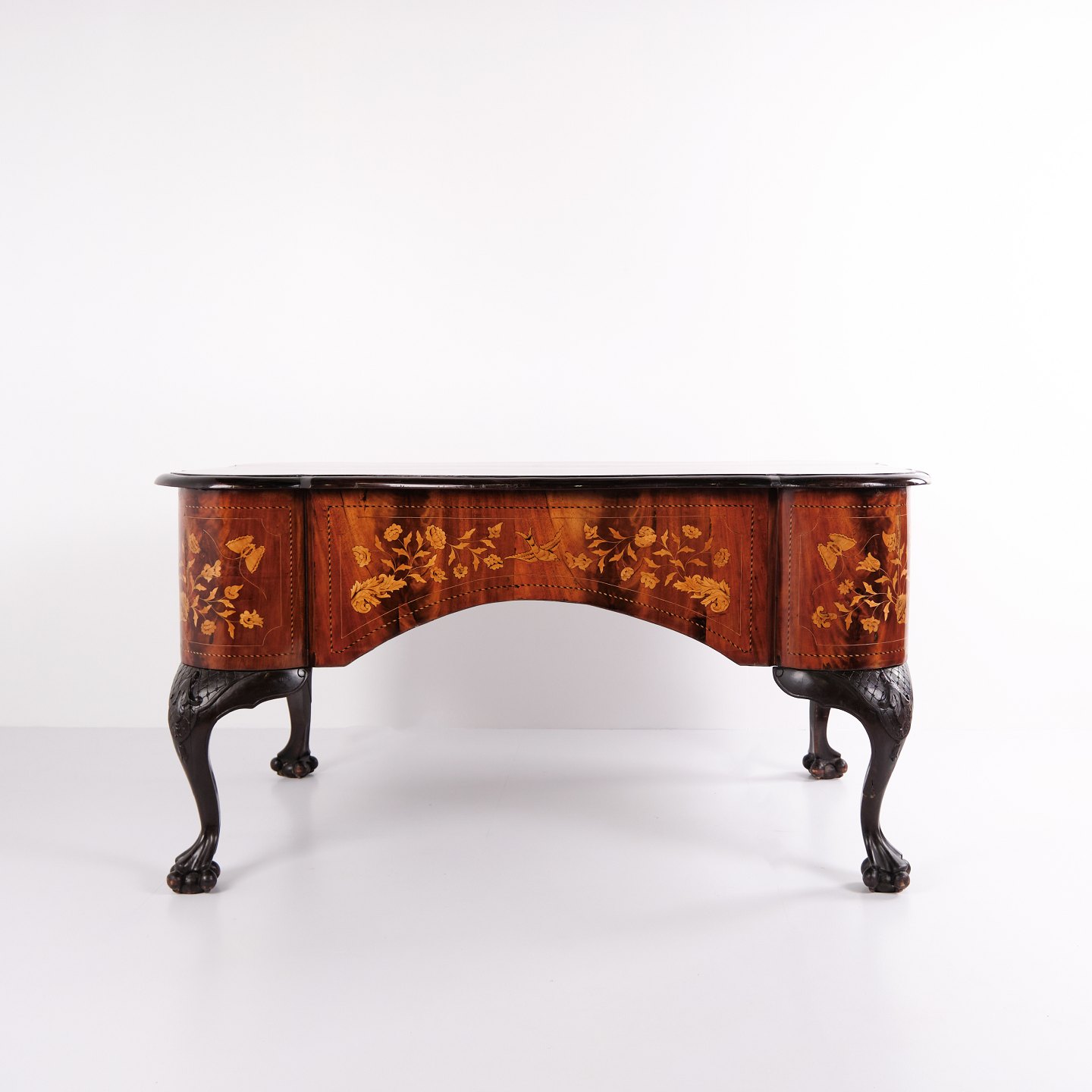 Beskrivelse: Skrivebord fra ca. 1860, udført i nøddetræ med detaljeret frugttræ-intarsia på både top og sider. Bordet er håndpoleret med shellak, hvilket giver en dyb glød og fremhæver det fine håndværk. Et elegant antikt møbel med rige dekorationer og solide materialer.