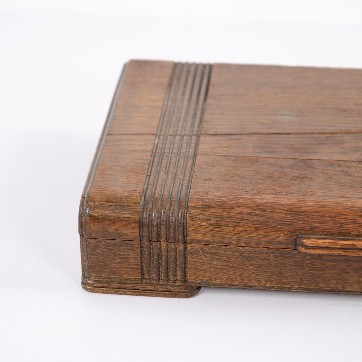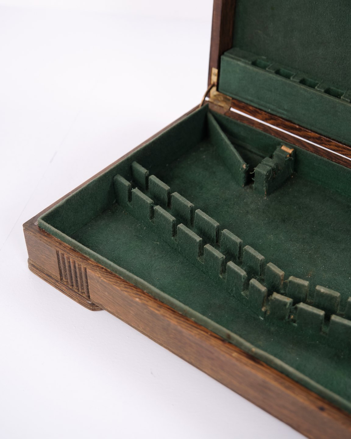 Description: Antique cutlery box in oak with green interior and brass fittings. Ideal for storing cutlery, silverware or small items. Solid craftsmanship with a decorative look.