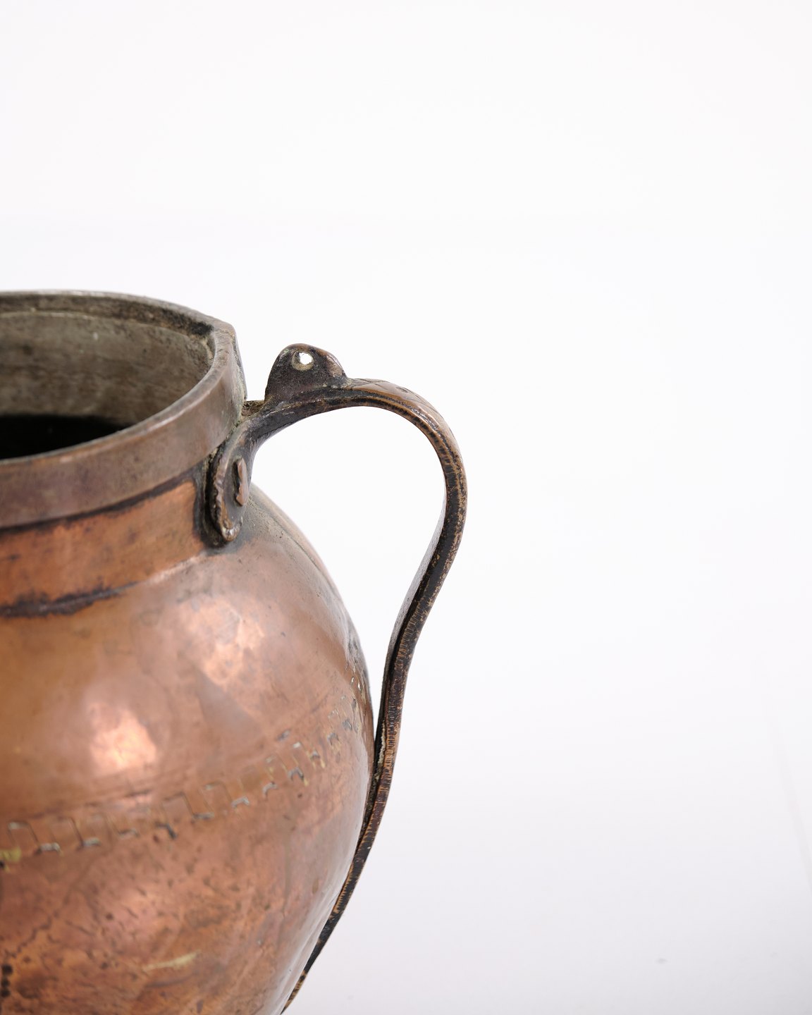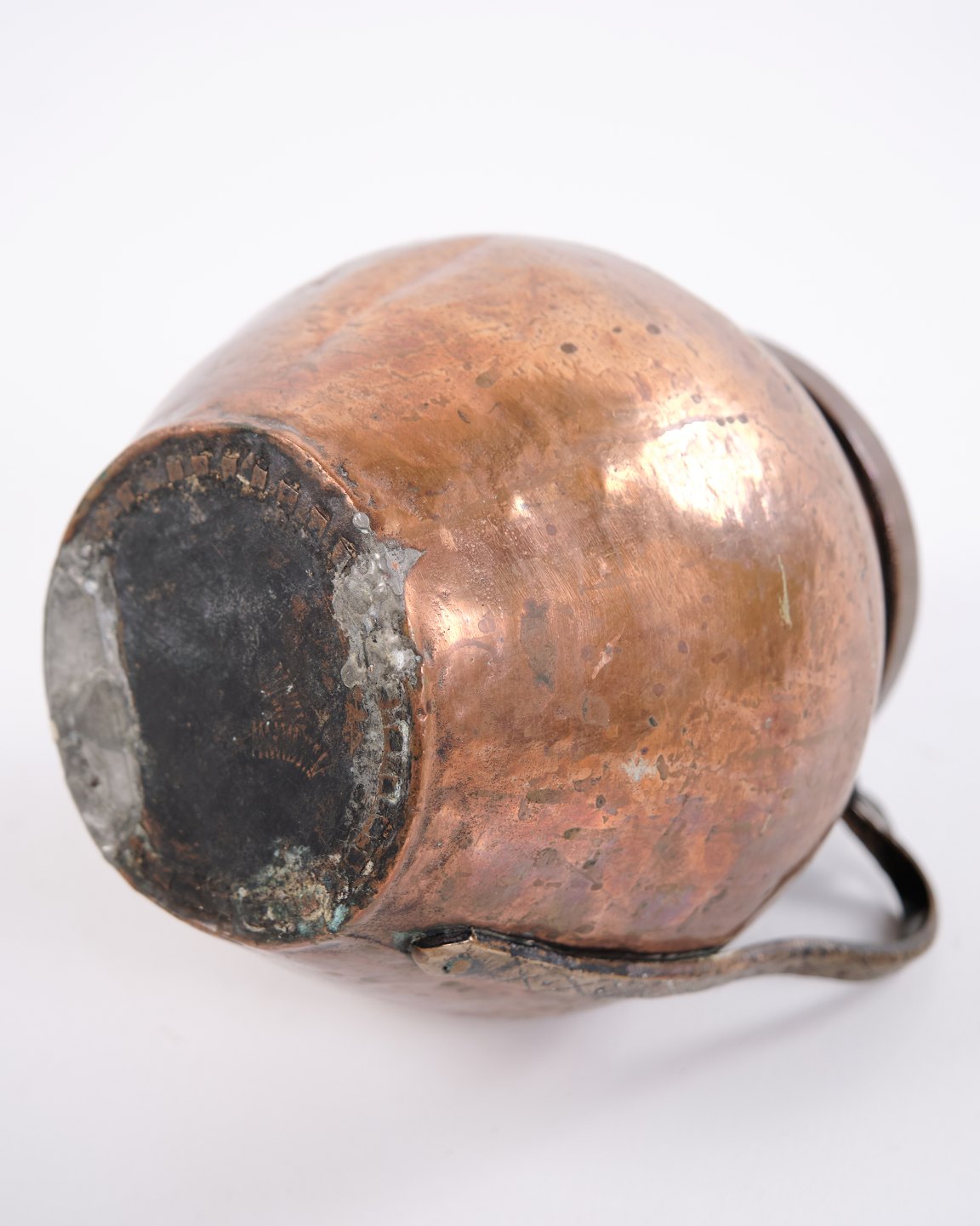 Description: Handmade copper pitcher from the 19th century with sturdy handle and classic shape. Danish origin. Suitable as antique decoration, collectible, or functional use.