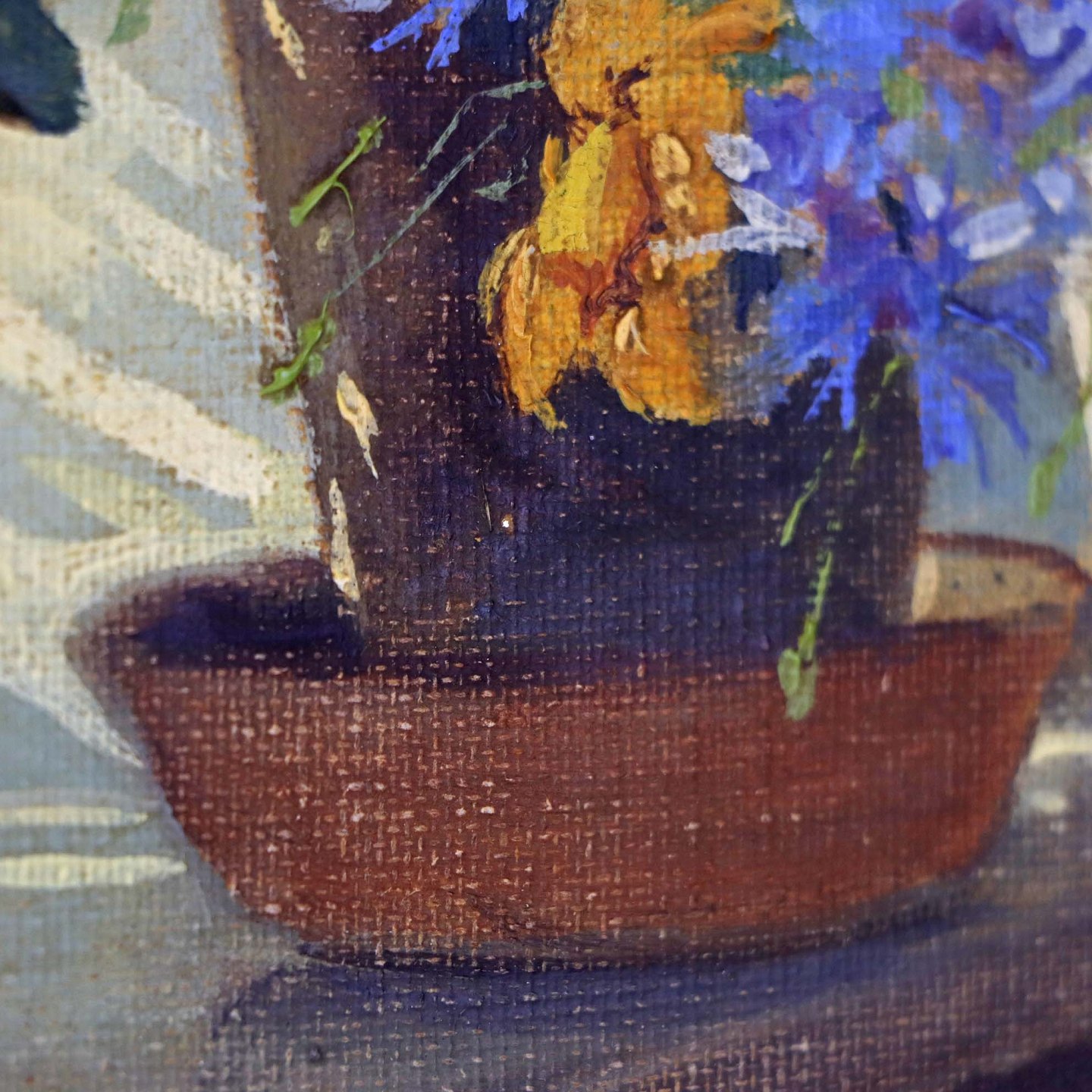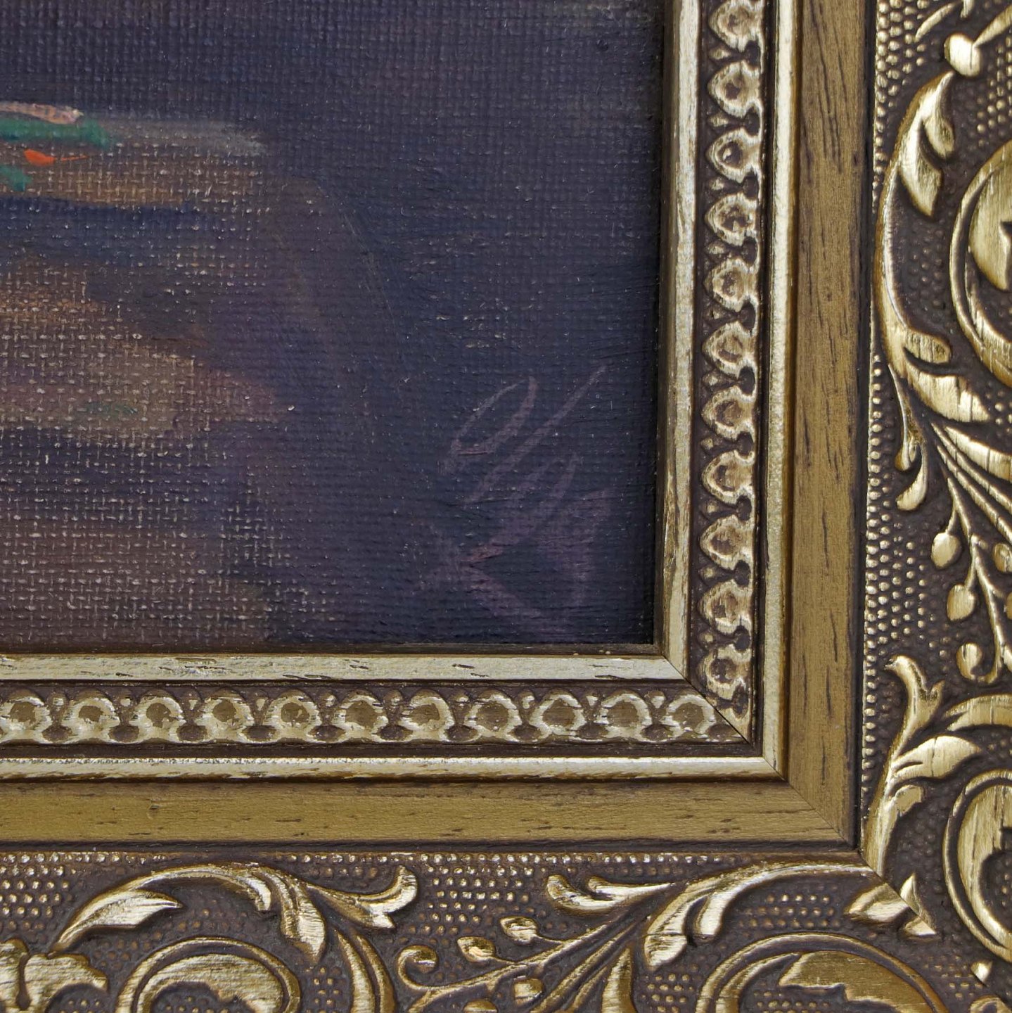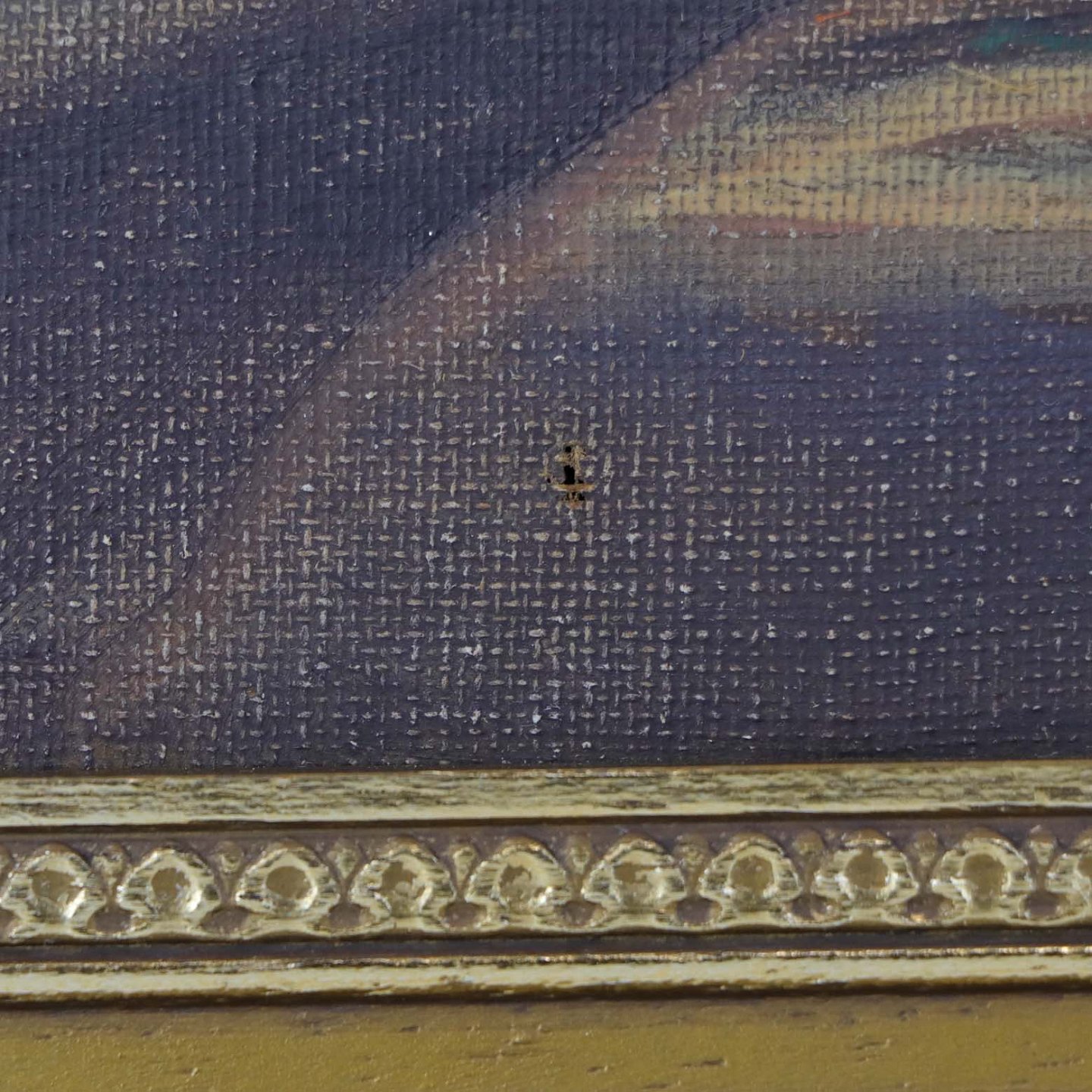 Beskrivelse: Oliemaleri på lærred i guldmalet træramme med stilleben motiv af blomster i vindueskarm.
