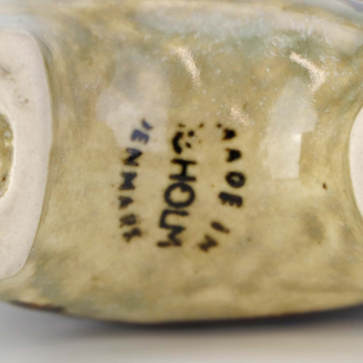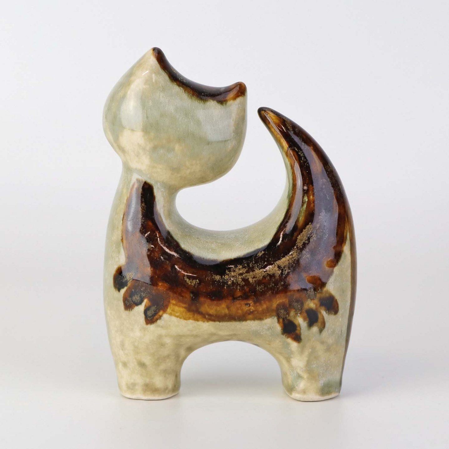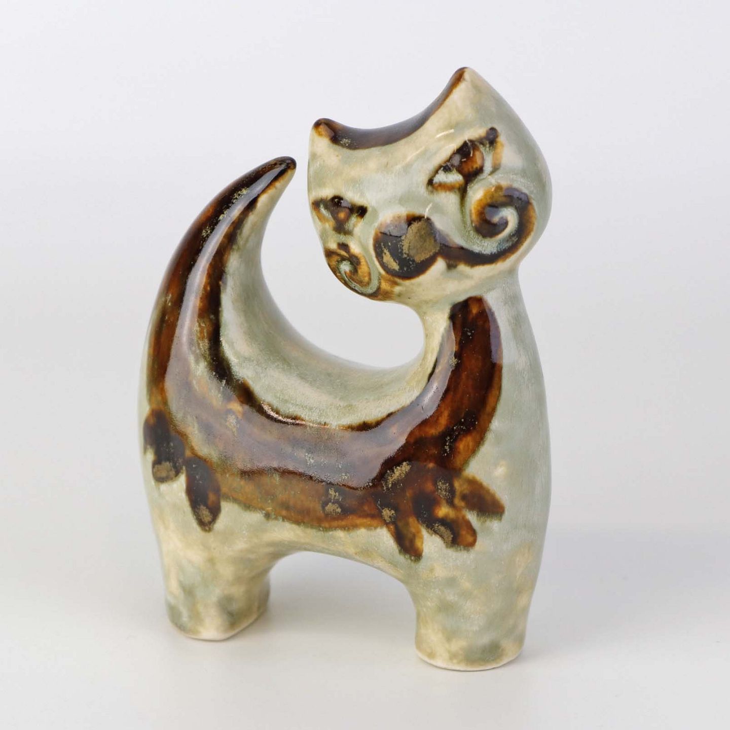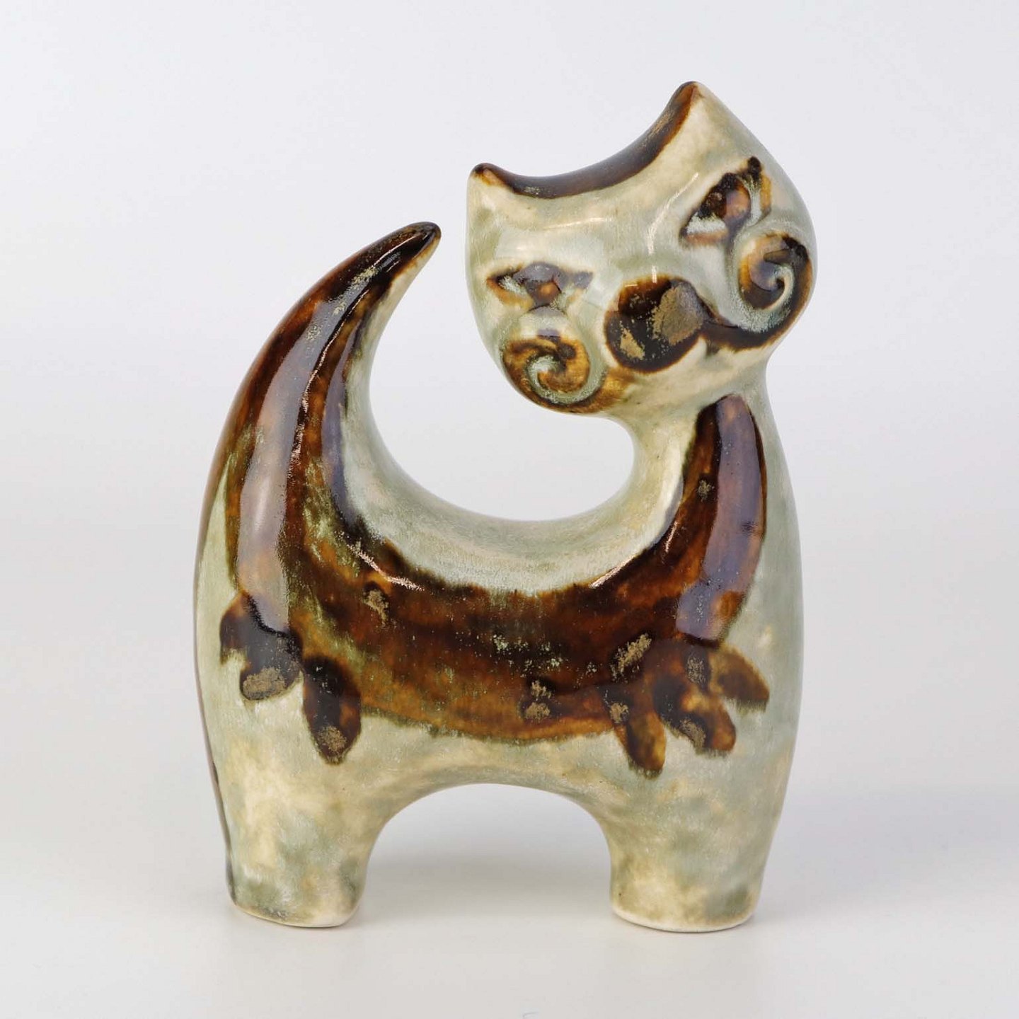 Beskrivelse: Figur i glaseret keramik med motiv af en kat.