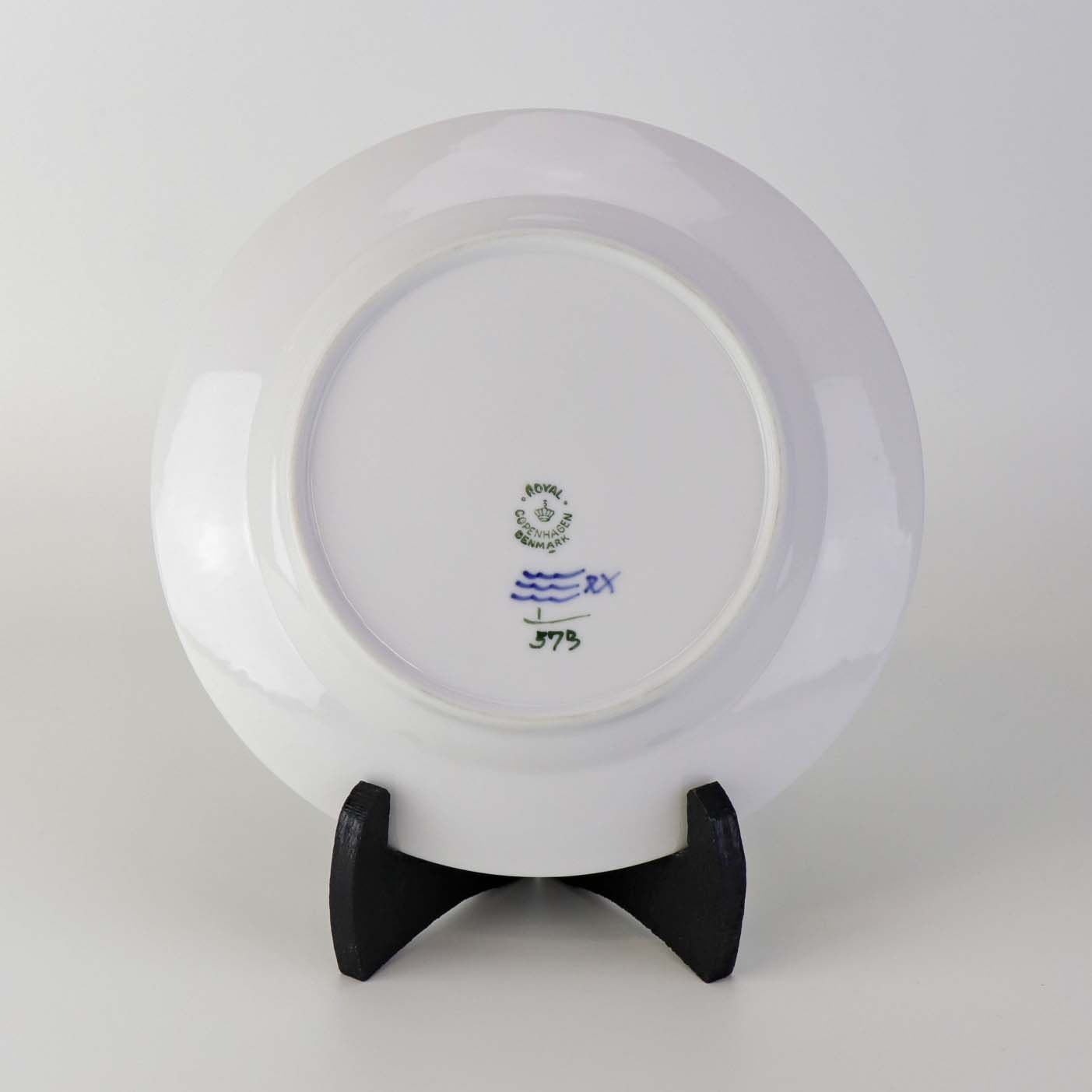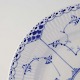 Beskrivelse: Stor desserttallerken i kongeligt porcelæn fra stellet Musselmalet Halvblonde. Nr. 1/573