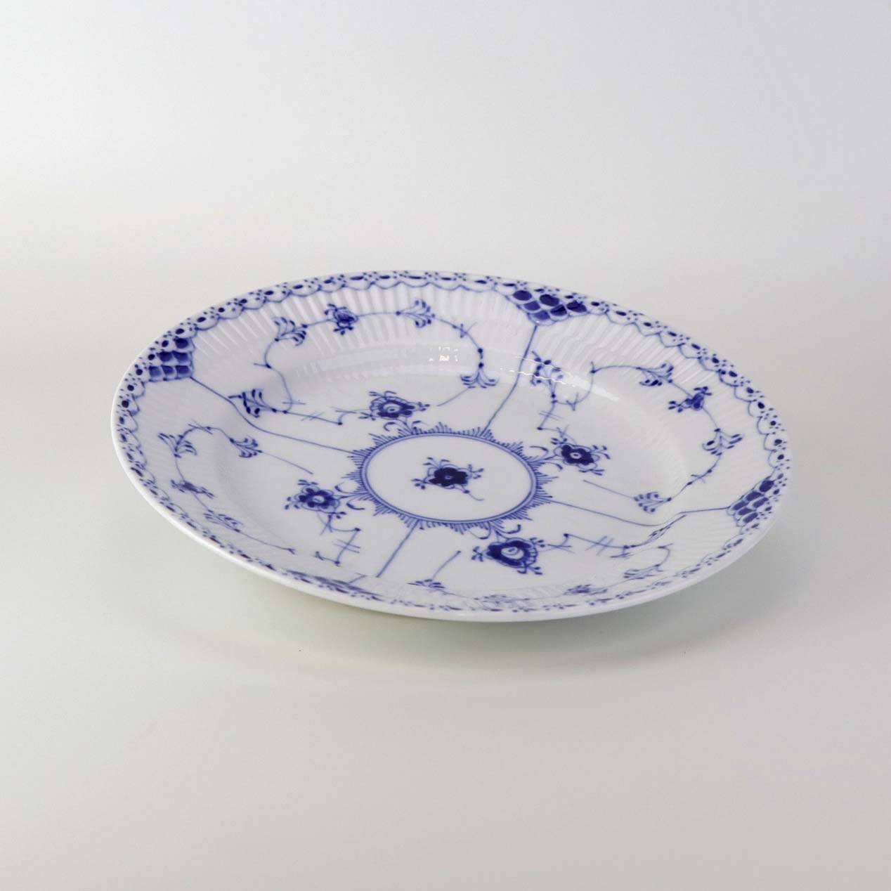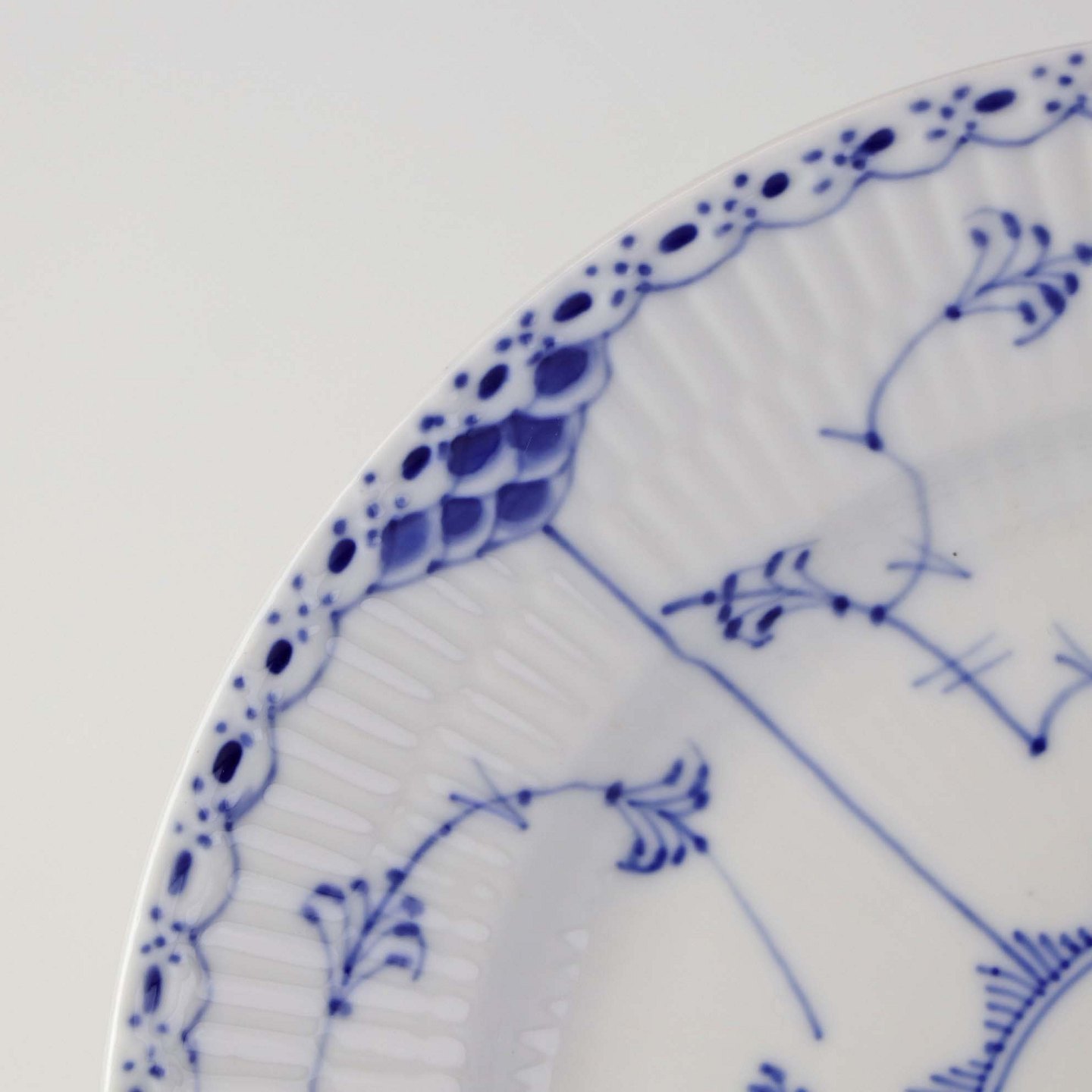 Musselmalet halvblonde er riflet hvidt porcelæn med dekoration af blå ranker og en kant med blonder.