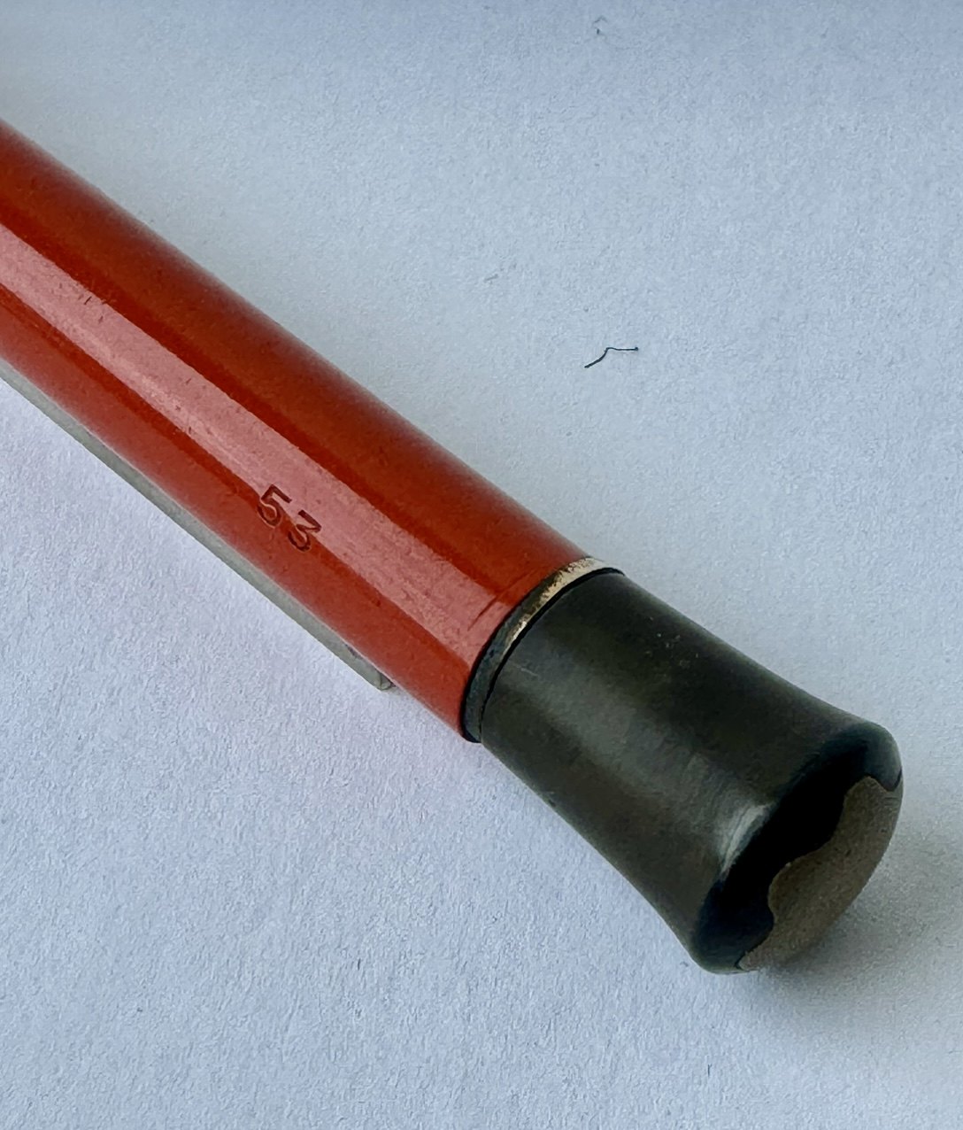 Description: THE ART DECO PERIOD: Coral red Montblanc no. 53 screw pencil with large inserted bone-white star on top. Manufactured in the 1920s. Functionality: The pencil leas can be unscrewed, but needs help to be screwed back. Does not naturally screw back when turning counter on the top. No damages. In good condition. Imprinted brand name MONTBLANC and model number 53. Measurements: 13,4 cm long