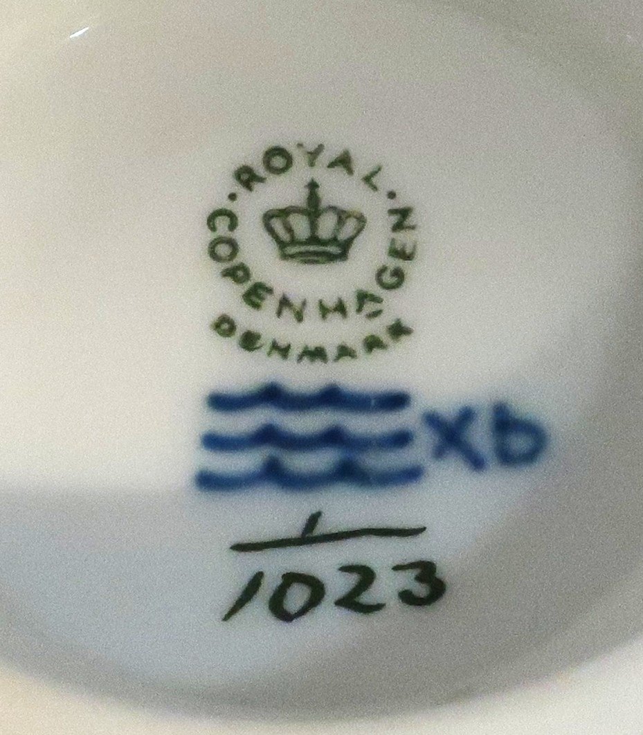 Beskrivelse: Royal Copenhagen. Musselmalet helblonde. Lille rund skål på fod. Model 1023. Højde 6 cm. Diameter 17,5 cm. (2 sortering)