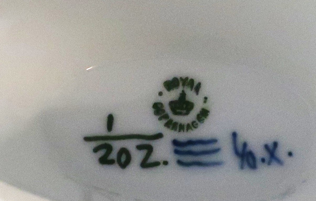 Beskrivelse: Royal Copenhagen. Musselmalet riflet. Sauceskål / sovseskål. Model 202. Længde 24,5 cm. (1 sortering). Produceret før 1923.