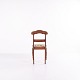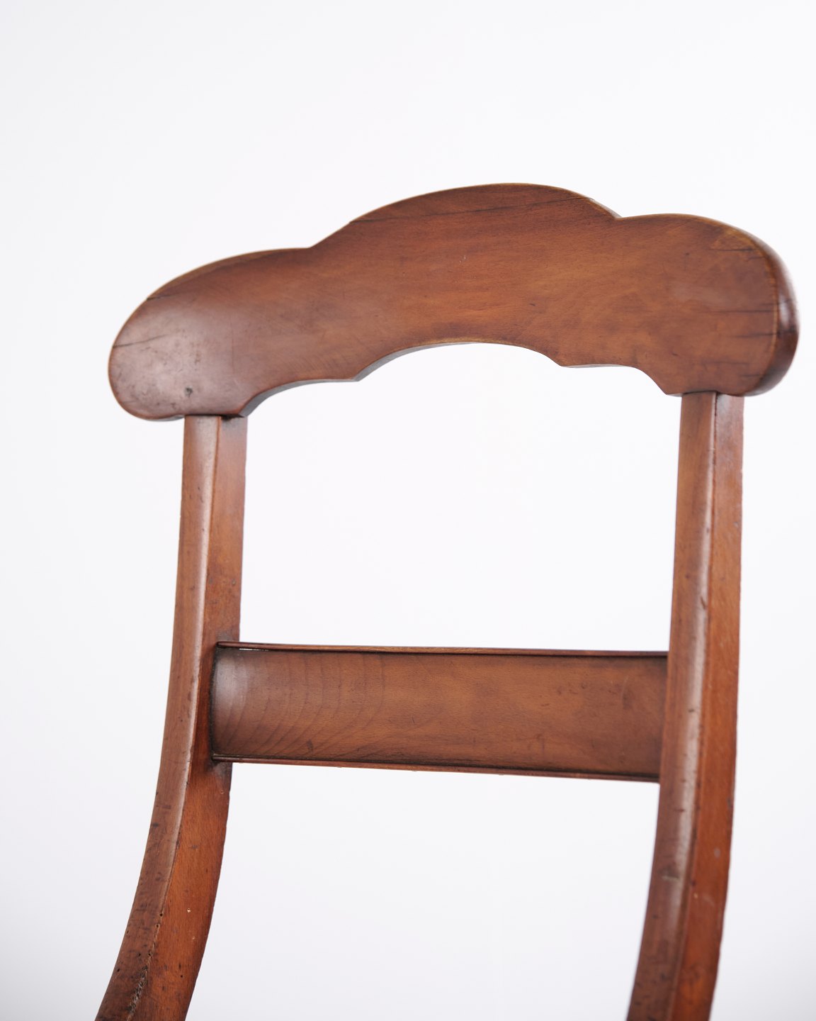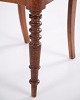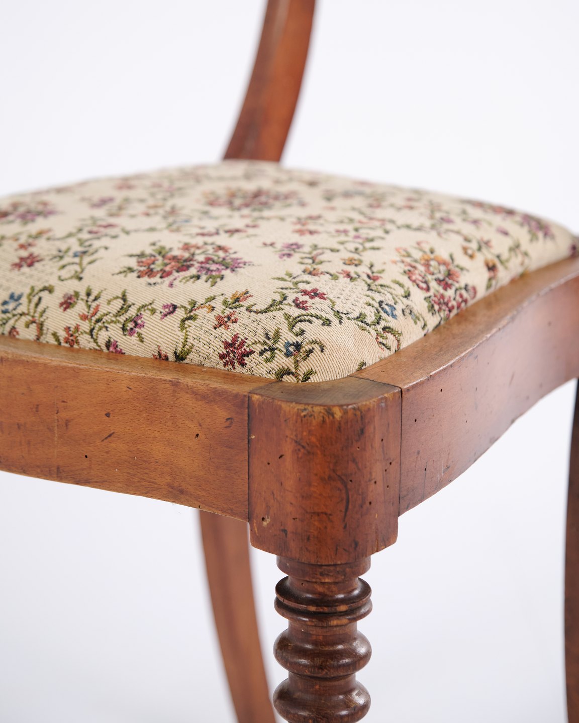 Beskrivelse: Spisebords- eller entréstol i sen Empire stil, udført i mahogni og polstret med blomstret stof. Klassisk design med tidstypiske linjer og let buet ryg. En dekorativ stol, der egner sig til både spiseområde og entré.