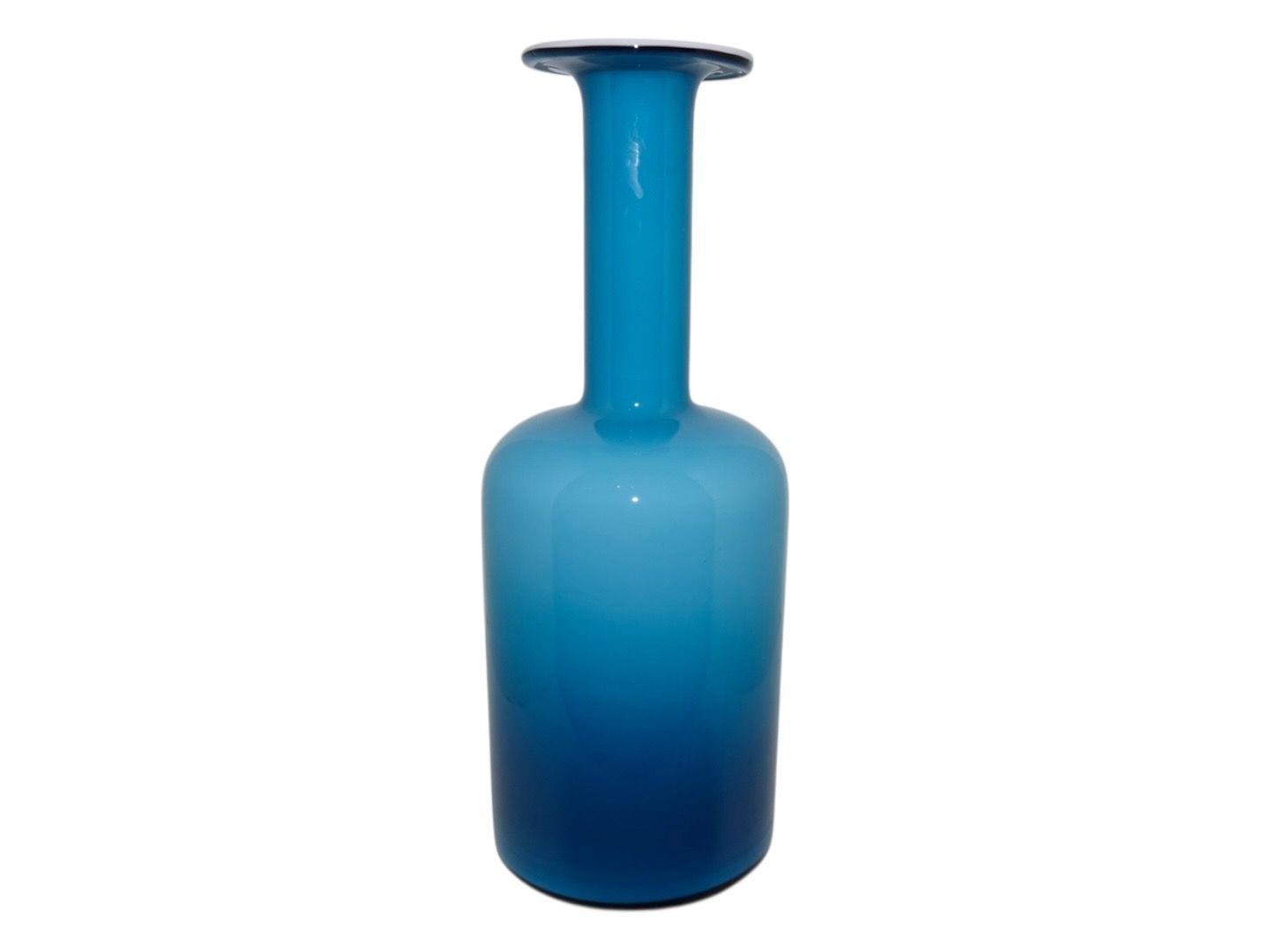 Beskrivelse: Holmegaard vase i blåt og hvidt opalglas.