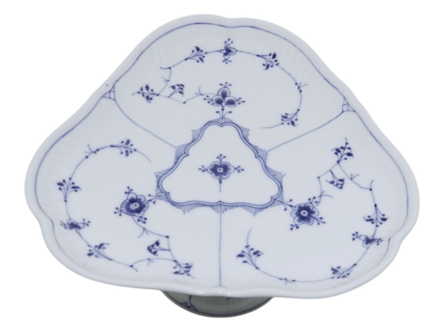 Beskrivelse: Royal Copenhagen Musselmalet Riflet, sjælden set trekantet kageopsats på fod.