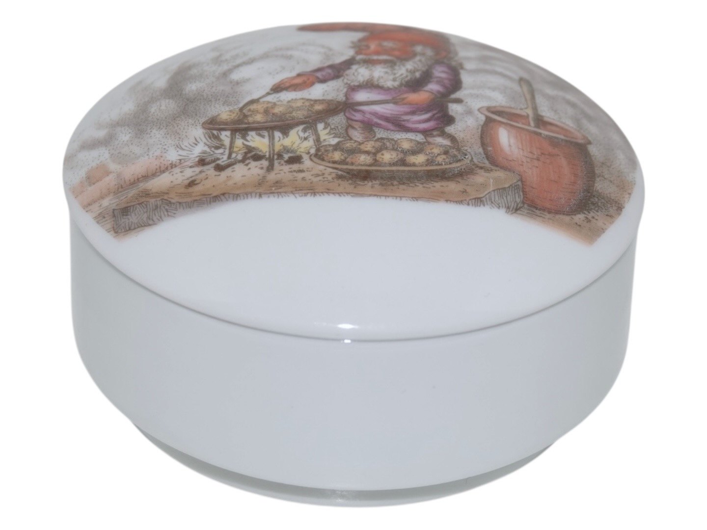 Beskrivelse: Bing & Grøndahl, rund bonbonniere med julenisse der bærer æbleskiver.