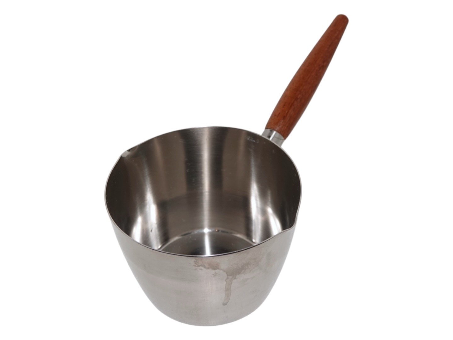 Description: Stelton stainless steel, small gray boat with teak wood handle.