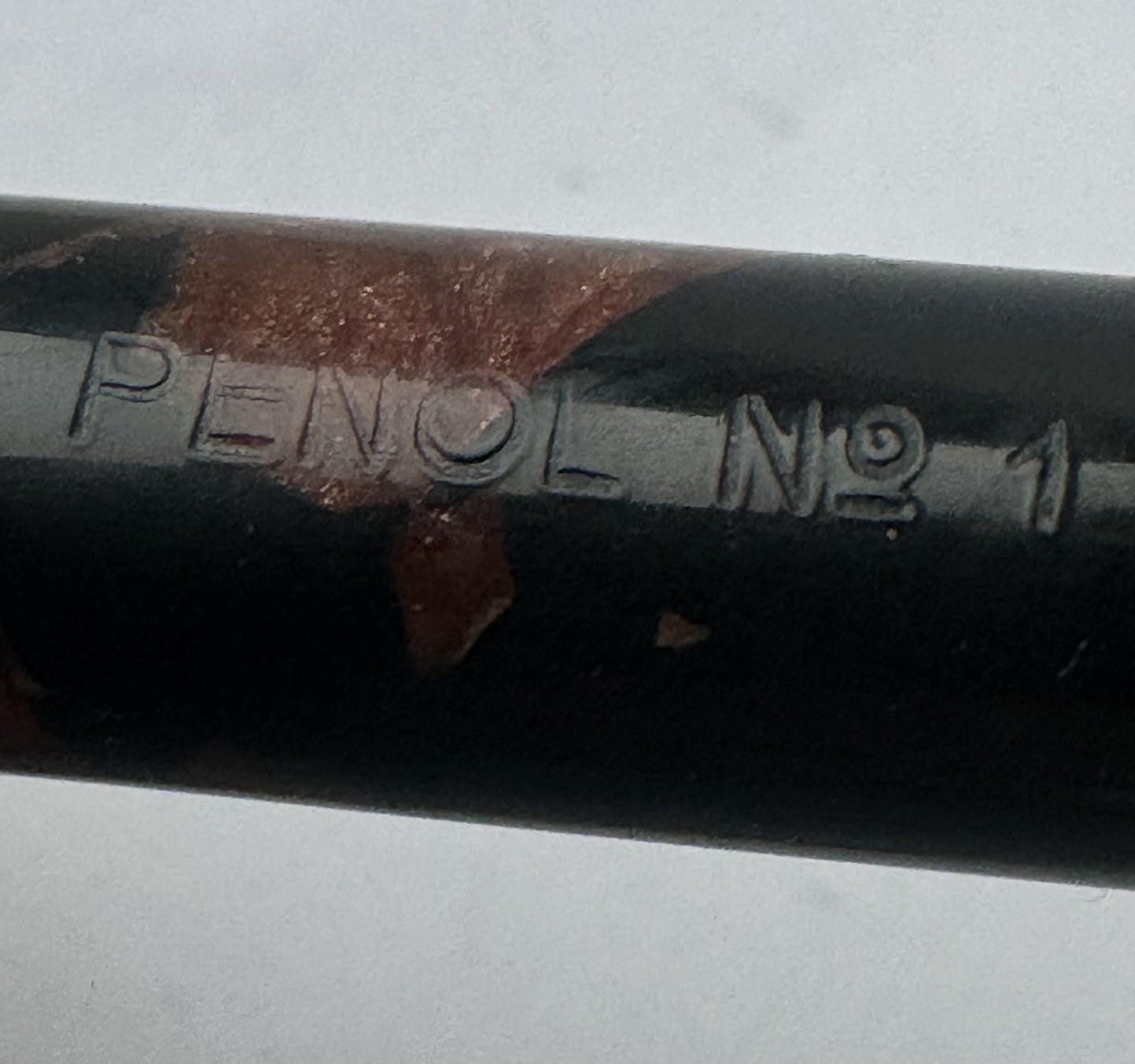 Description: Black and red-brown marbled Penol. No. 1 fountain pen. Appears in good condition without damage or repairs. Does not work. A new rubber sack must be inserted before the fountain pen can absorb ink and write again. The tip is original Penol 14 carat gold tip. Length: 11,2 cm
