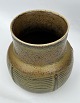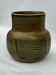 Description: Royal Copenhagen stoneware vase. Designed by Gerd Bøgelund Covered with a green solfatara glaze. Factory first quality. Factory mark on the bottom. Artist's signature gb incised. H. 13.3 cm. In good condition. Diameter in the middle of the vase approx. 13 cm
