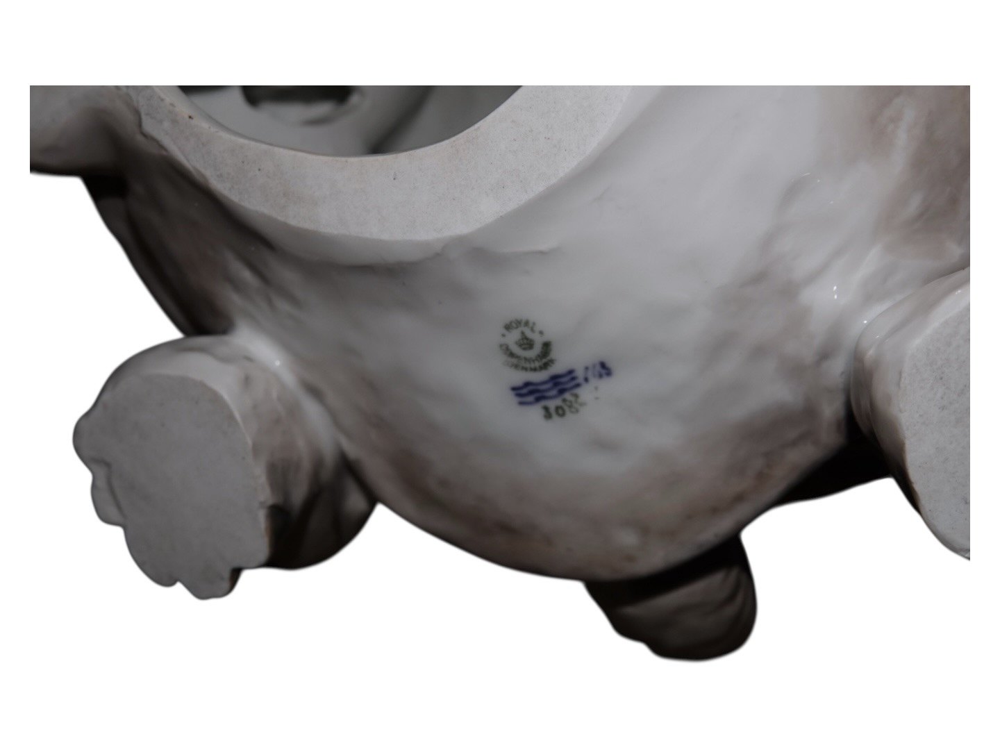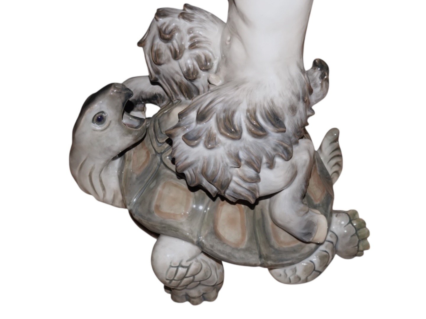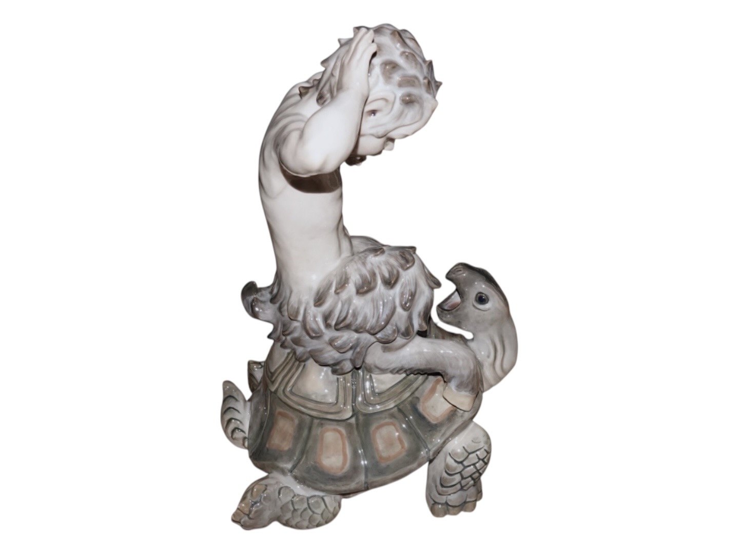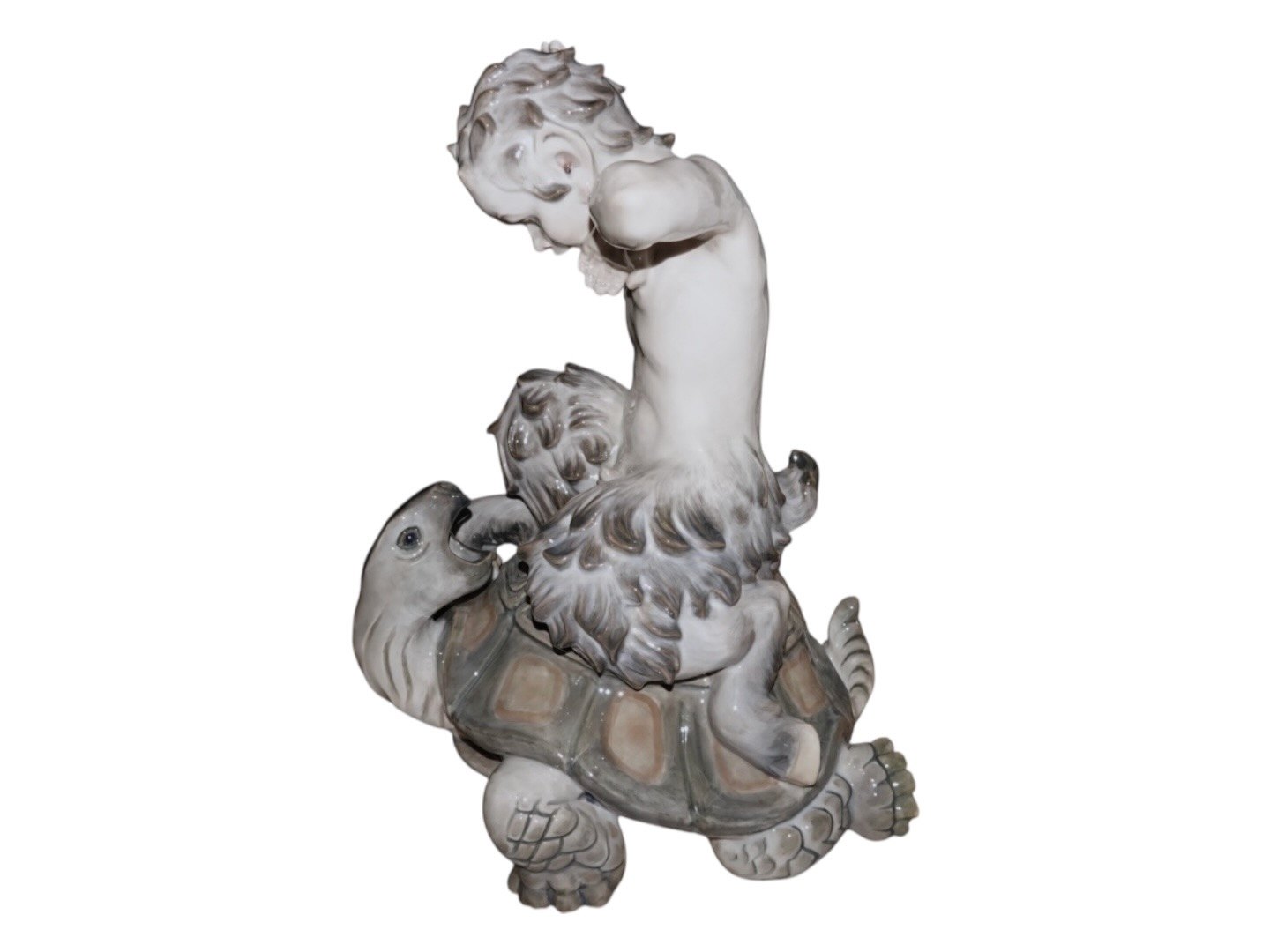 Beskrivelse: Meget sjælden kæmpe Royal Copenhagen figur, pan (faun) der kæmper med en skildpadde. På det første billede er der en "almindelig" pan figur for at illustrere størrelsesforskellen.