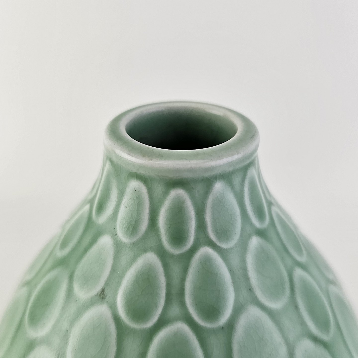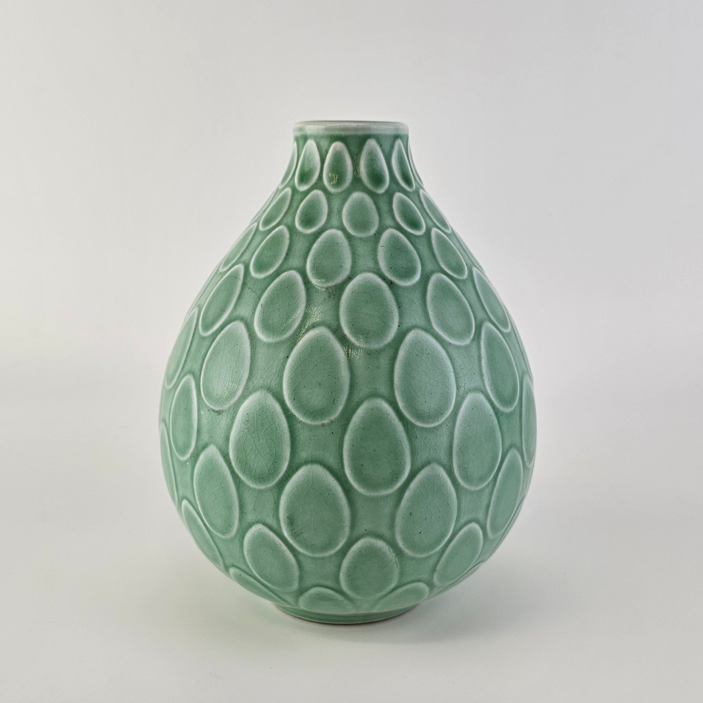 Beskrivelse: Vase i mintgrøn fajance med dråbemønster