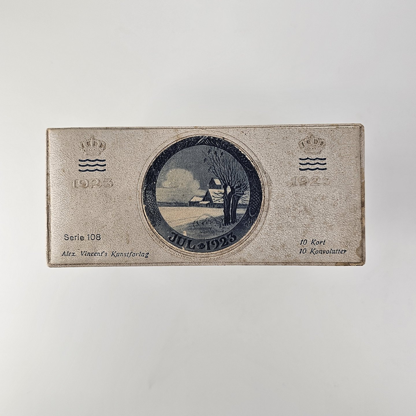Beskrivelse: Brevkort med motiv af juleplatte fra 1923 fra Bing & Grøndahl og Royal Copenhagen. 10 kort og 10 kuverter