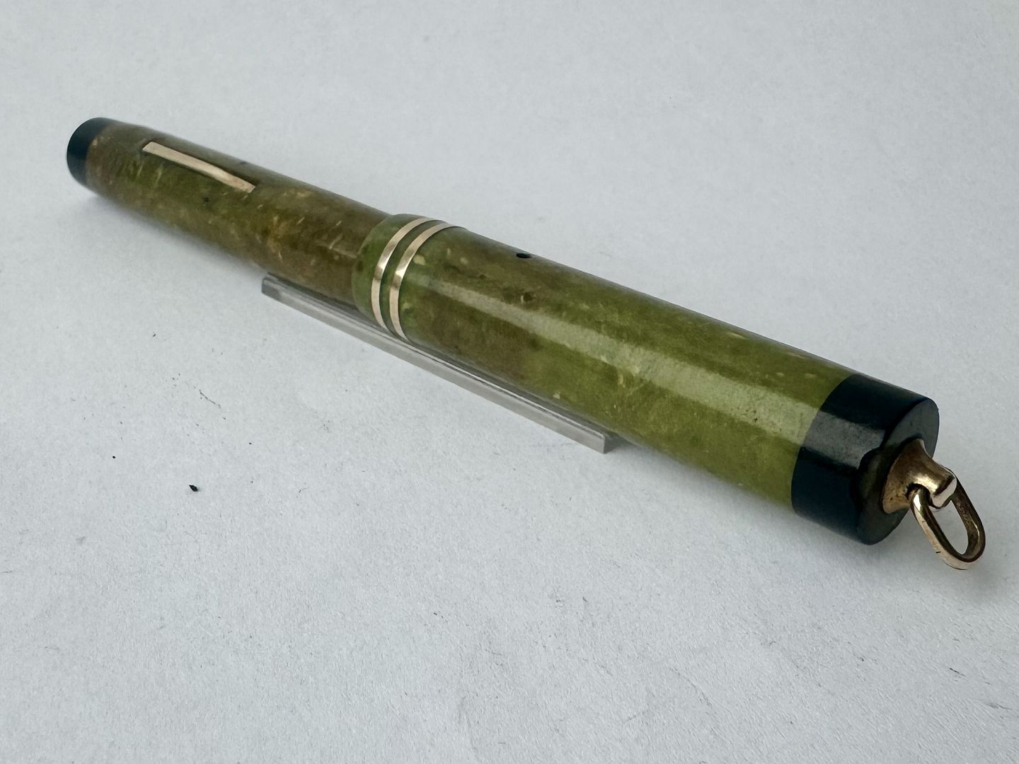 Beskrivelse: Kort Sheaffer’s fyldepen med lever filler. Monteret lille øsken øverst på hætten. Før end fyldepennen igen fungerer skal der indsættes en ny gummisæk, så blæk kan påfyldes. Fremstår ellers i fin stand med alle originale Sheaffer’s dele. Length: 11,8 cm
