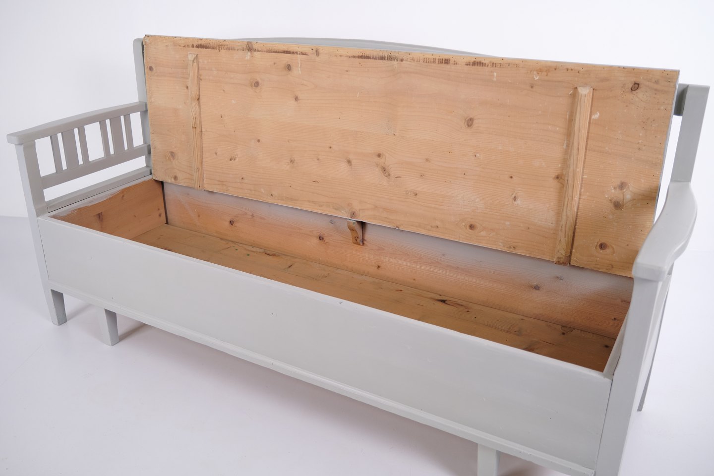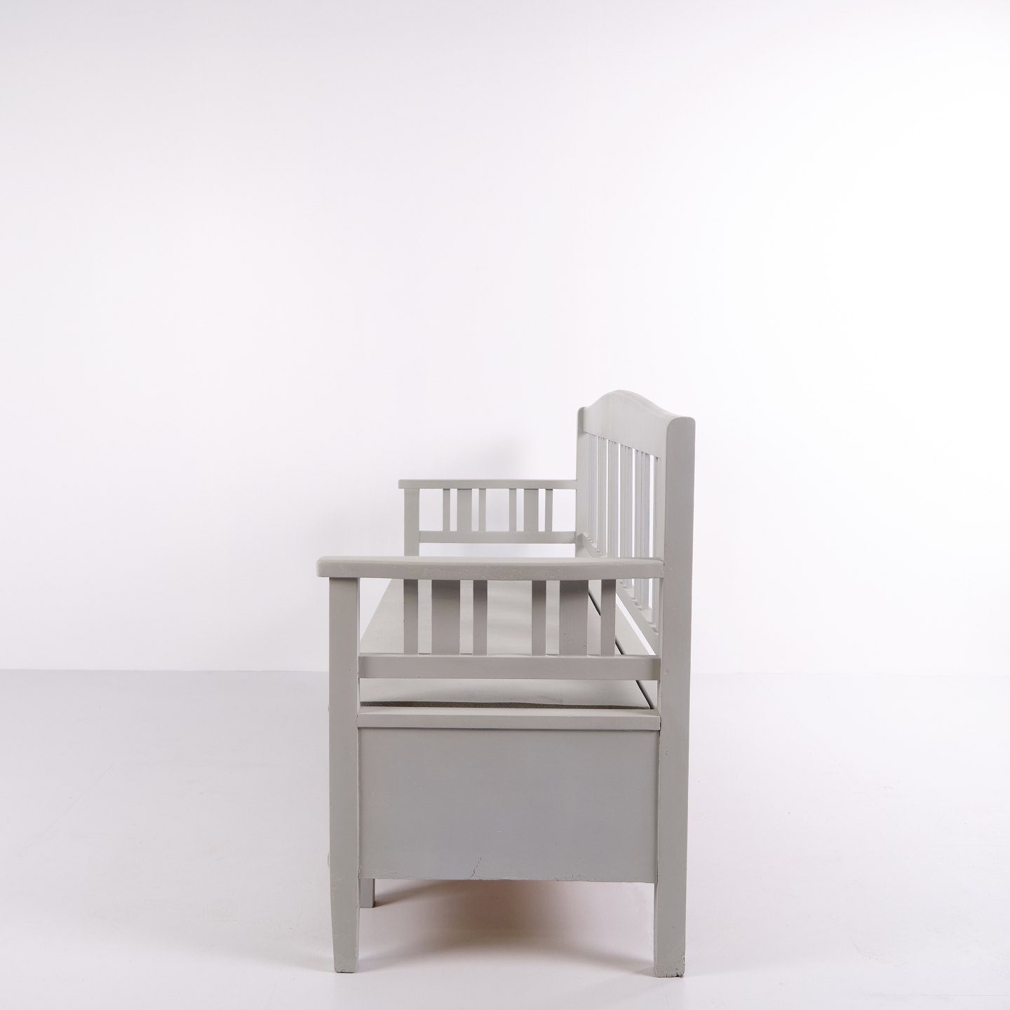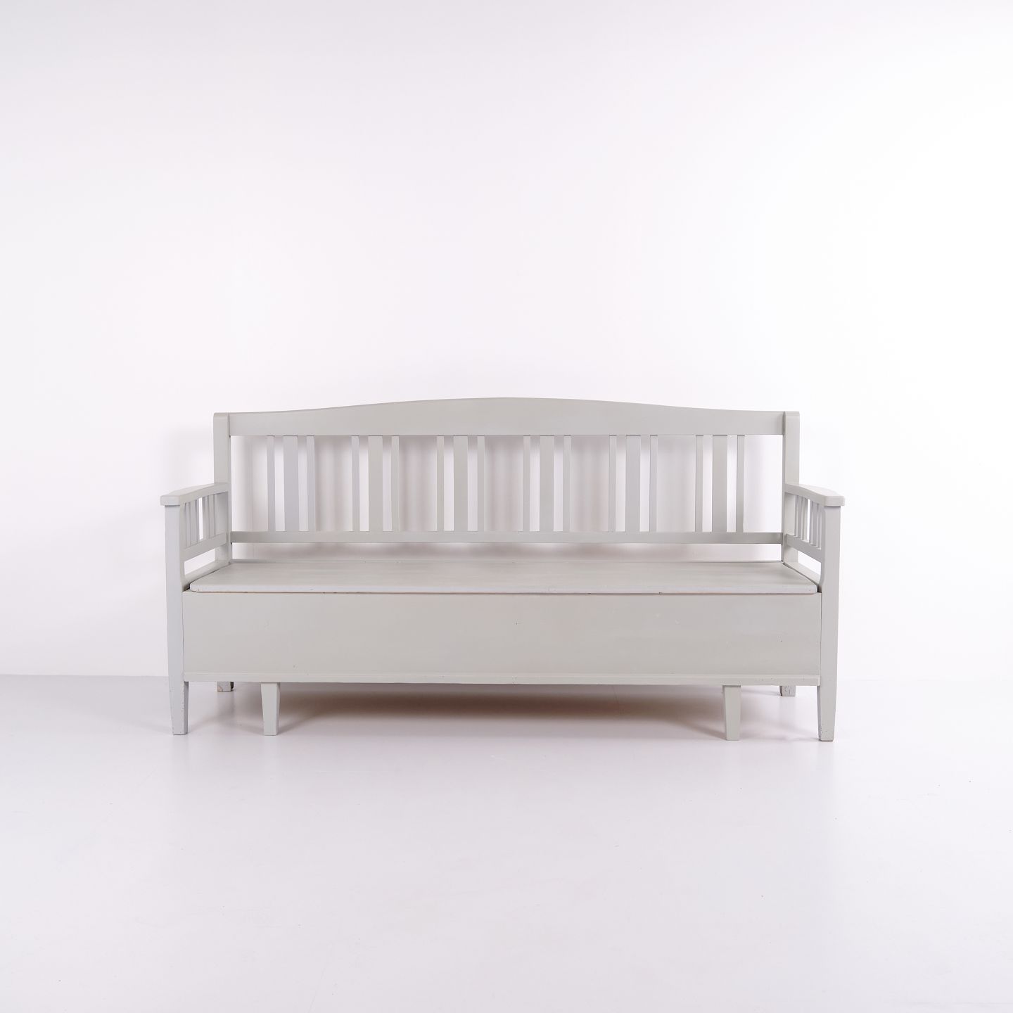Beskrivelse: Svensk slagbænk fra ca. 1860’erne, udført i fyrretræ og gråmalet i senere tid. Klassisk skandinavisk møbel med dekorative bemalinger og god opbevaringsplads under sædet. Velbevaret antikt møbel med tidstypiske detaljer.