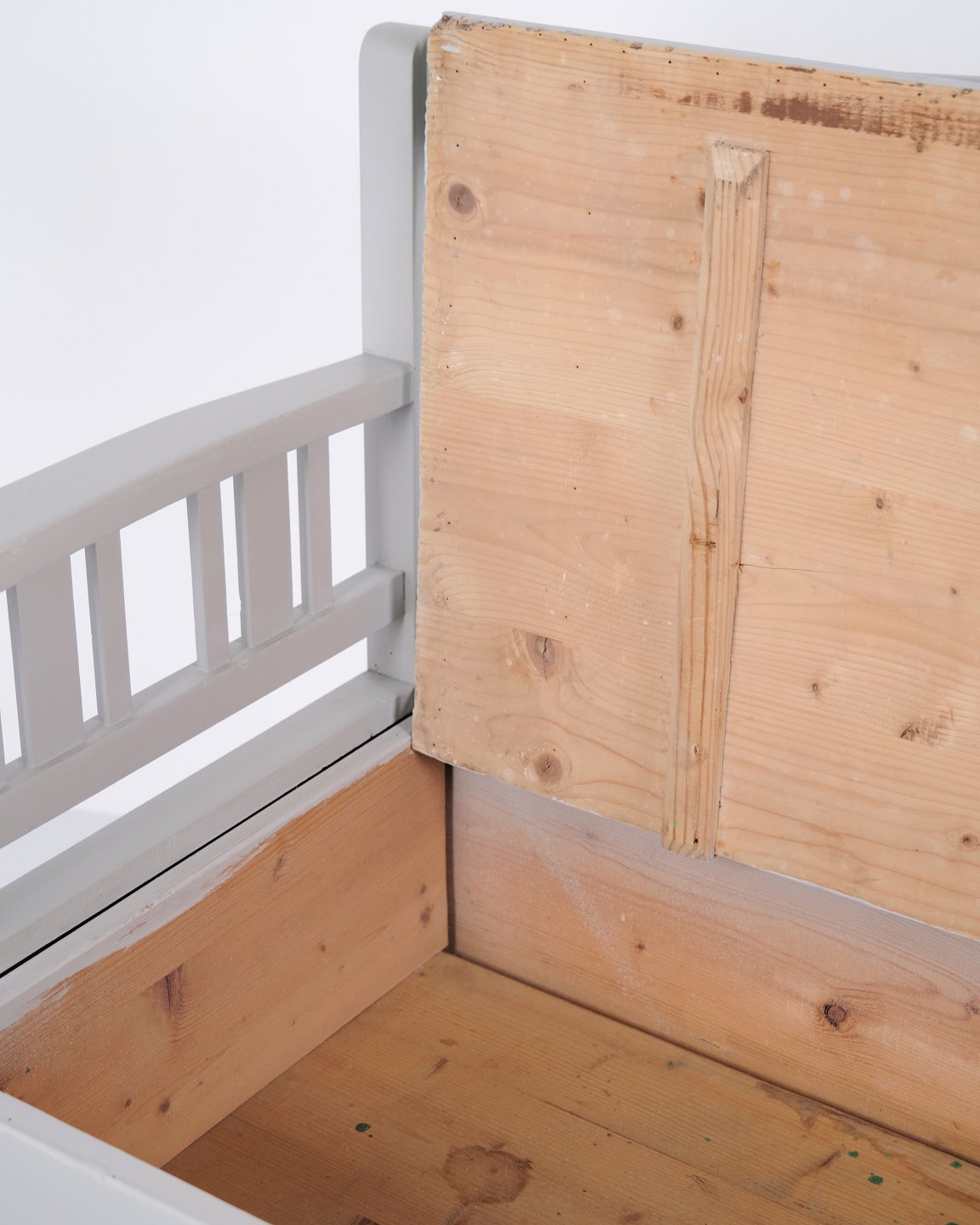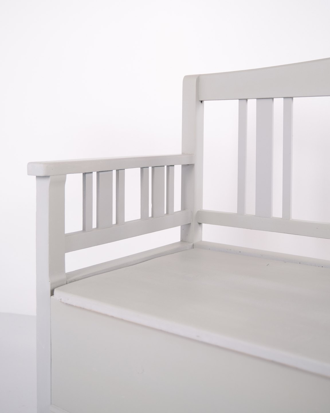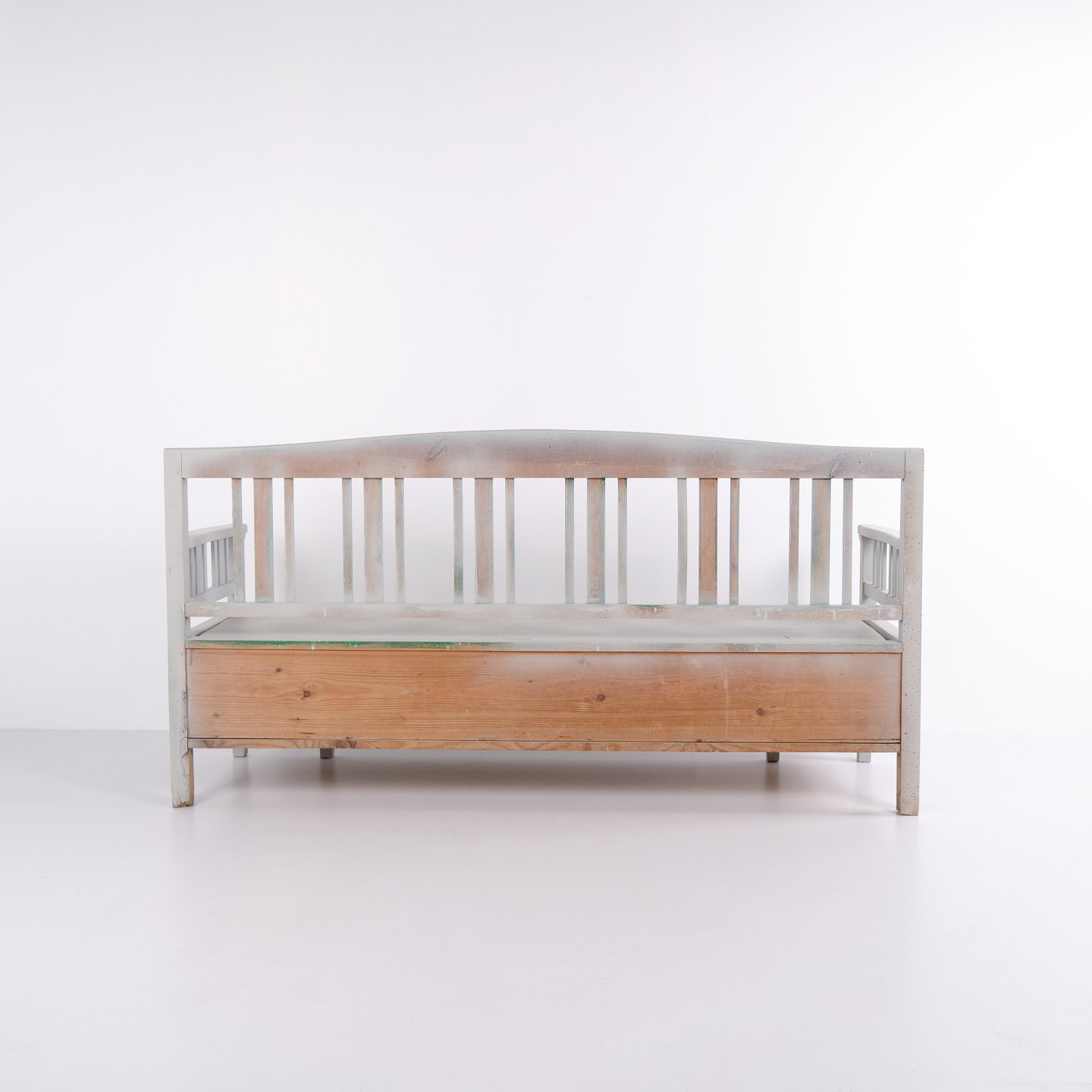 Beskrivelse: Svensk slagbænk fra ca. 1860’erne, udført i fyrretræ og gråmalet i senere tid. Klassisk skandinavisk møbel med dekorative bemalinger og god opbevaringsplads under sædet. Velbevaret antikt møbel med tidstypiske detaljer.