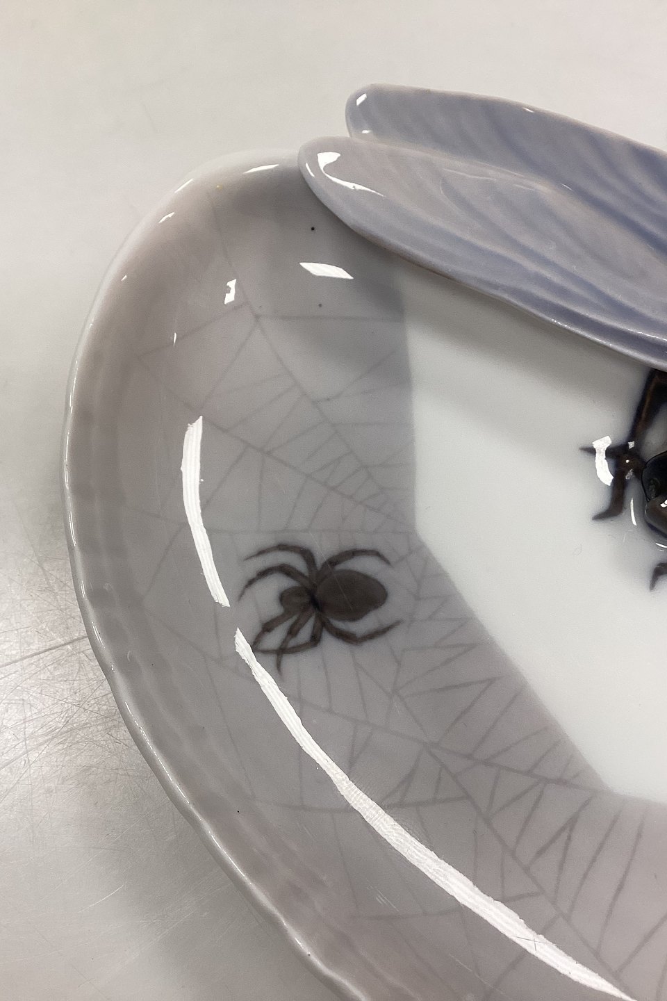 Beskrivelse: Royal Copenhagen Art Nouveau Skål - Guldsmed og Edderkop No. 9/15. Små sorte nister i glasuren, se foto.