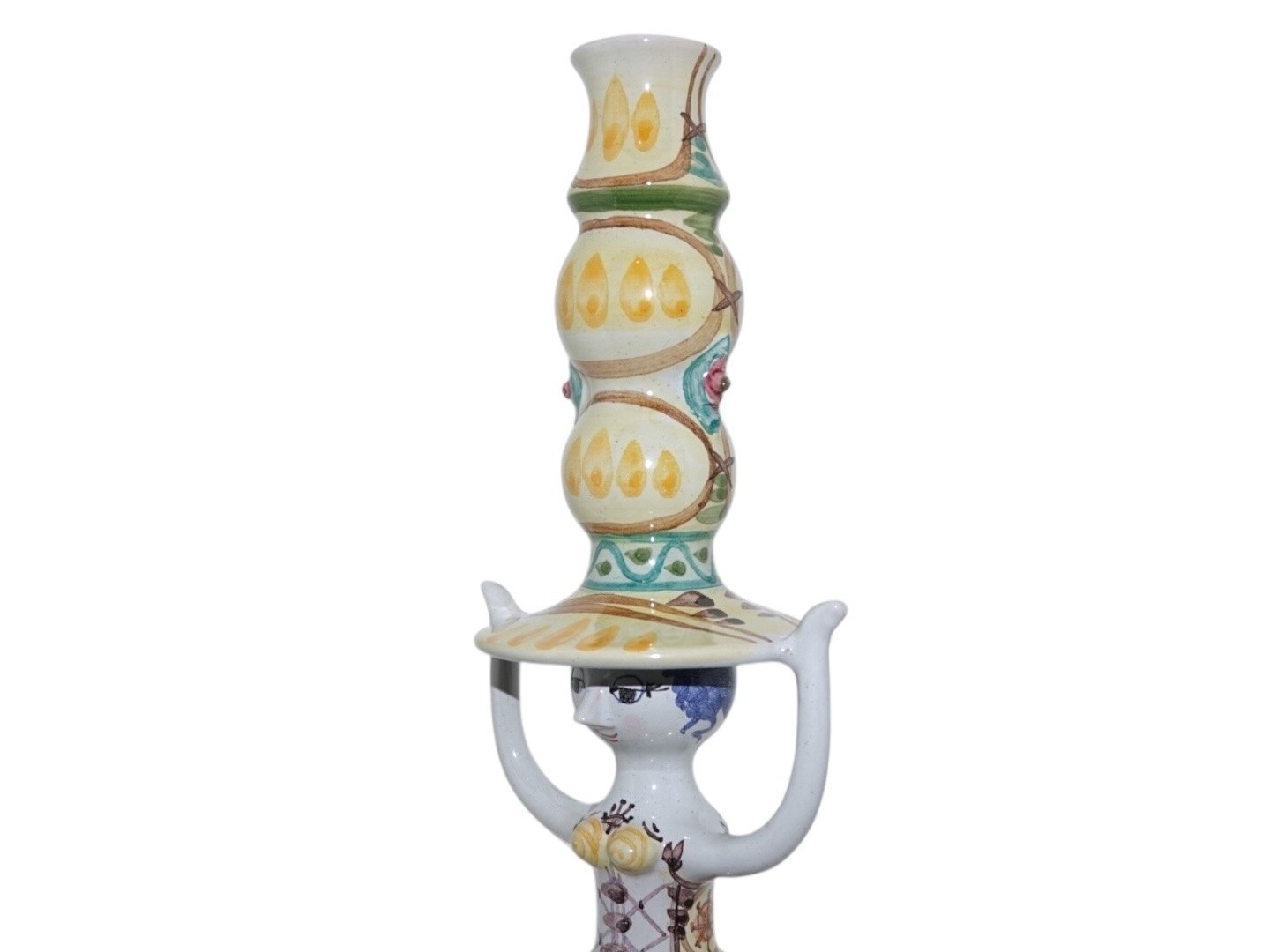 Beskrivelse: Bjørn Wiinblad keramik, høj figur af dame i gule farver fra 1974.