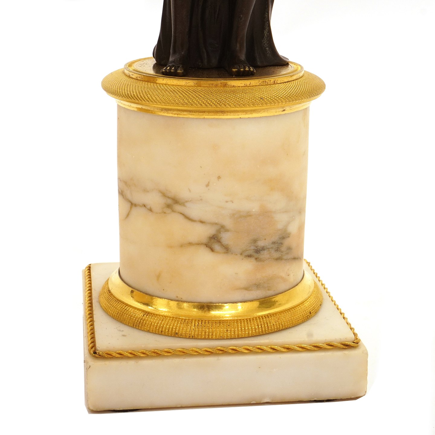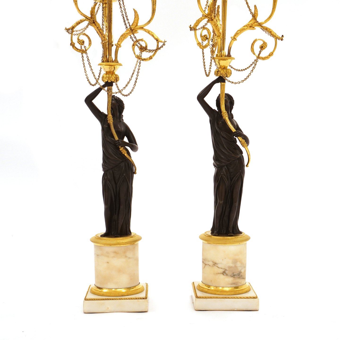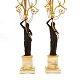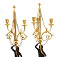 Beskrivelse: Et par store lueforgyldte og delvist sortpatinerede bronzekandelabre med marmorfod og -stamme