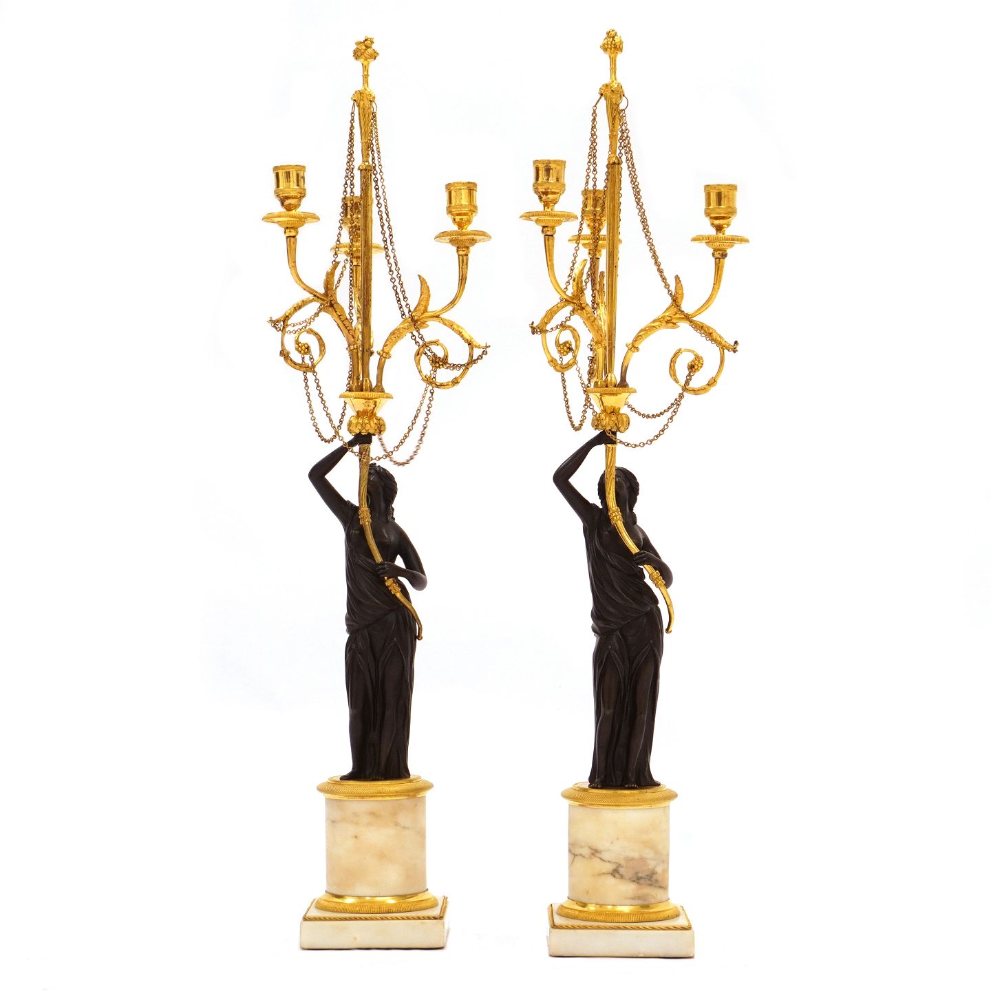 Et par store lueforgyldte og delvist sortpatinerede kandelabre med marmorfod og -stamme. Frankrig ca. år 1810. H: 73cm