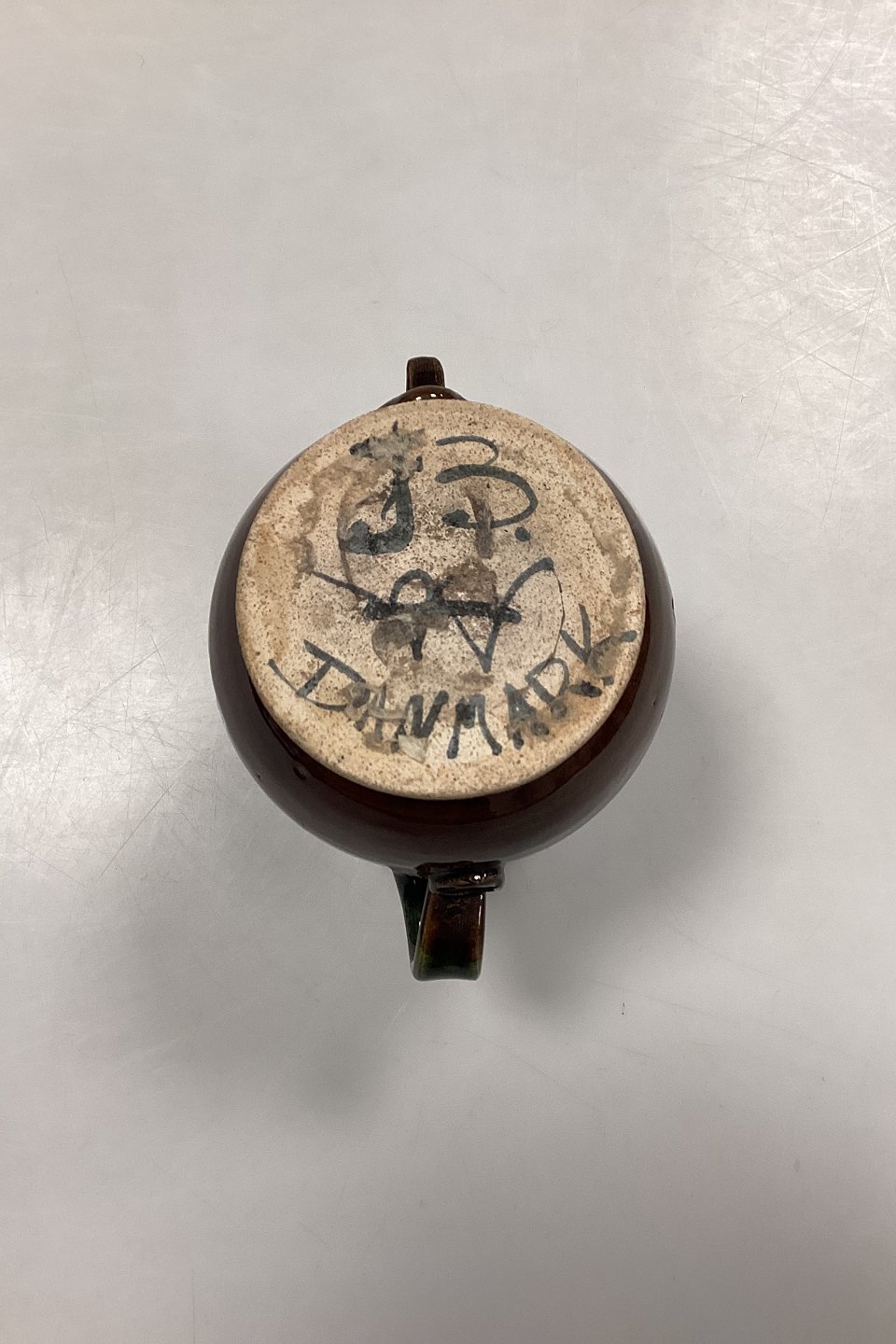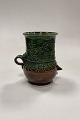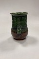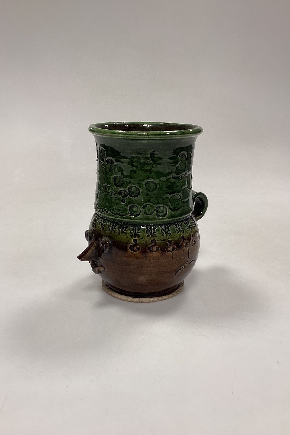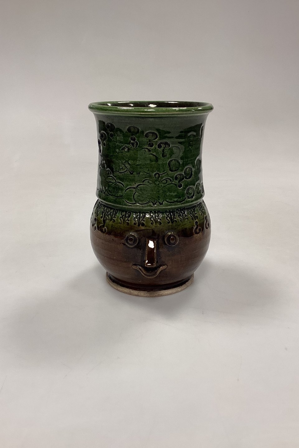 Description: Bjørn Wiinblad Vase in glazed Stoneware. Motif with face, handle and embossed stencil patterns in brown and green glaze.