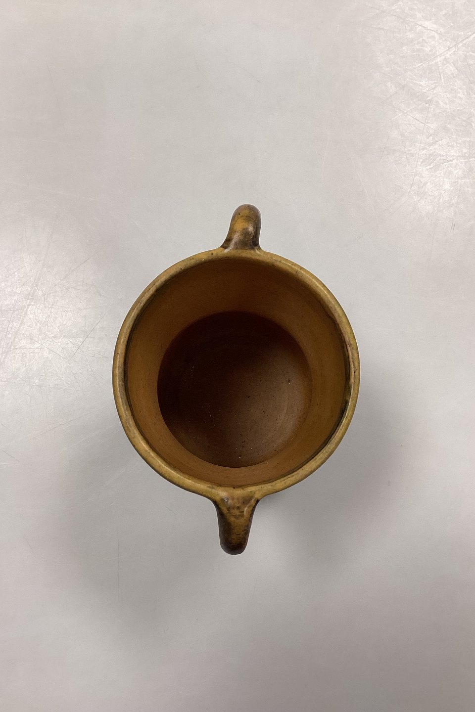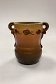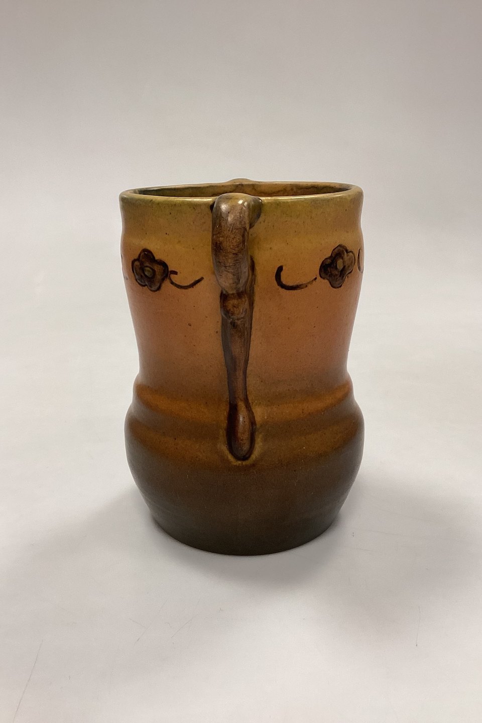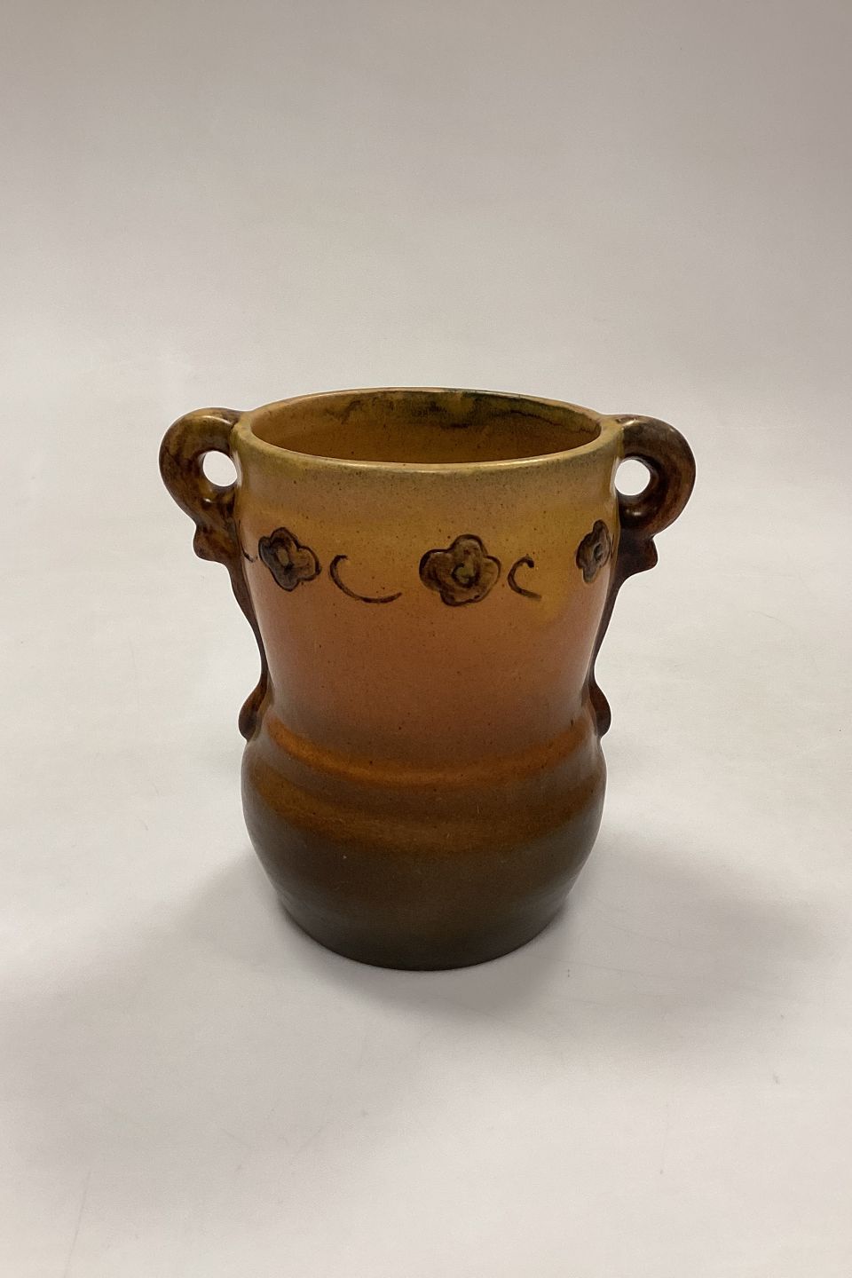 Description: P. Ipsen's Widow Vase No. 412. Stoneware with yellow and brown glaze, with embossed flowers on the edge.