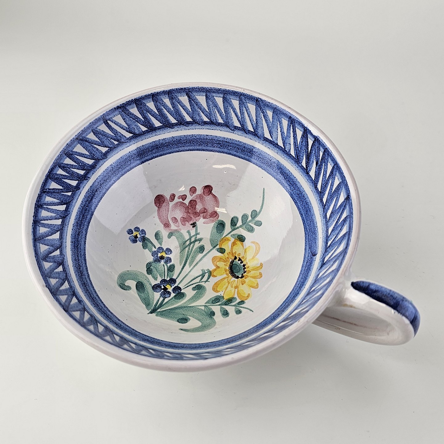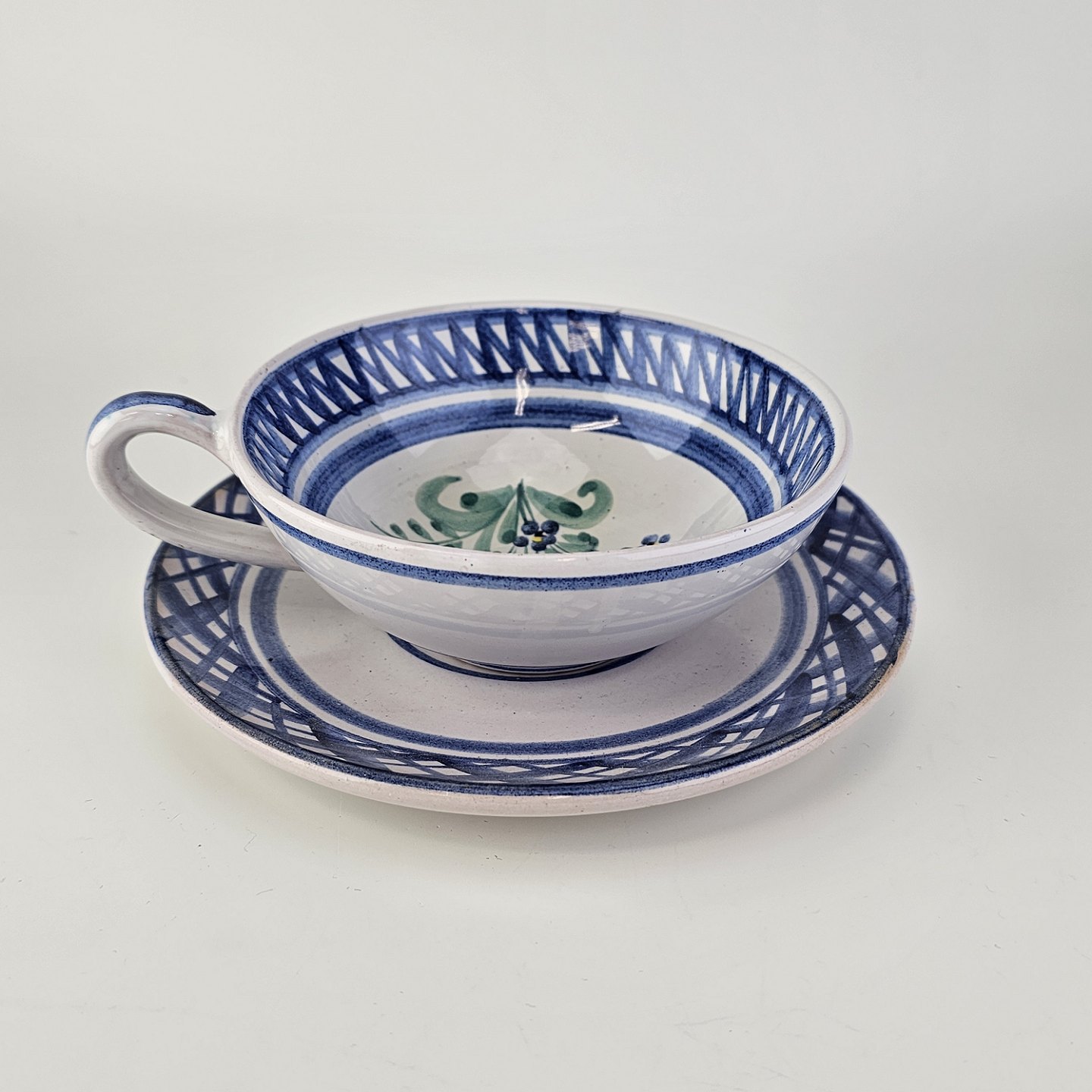 Beskrivelse: Kop og underkop i keramik med blå detaljer og blomsterdekoration