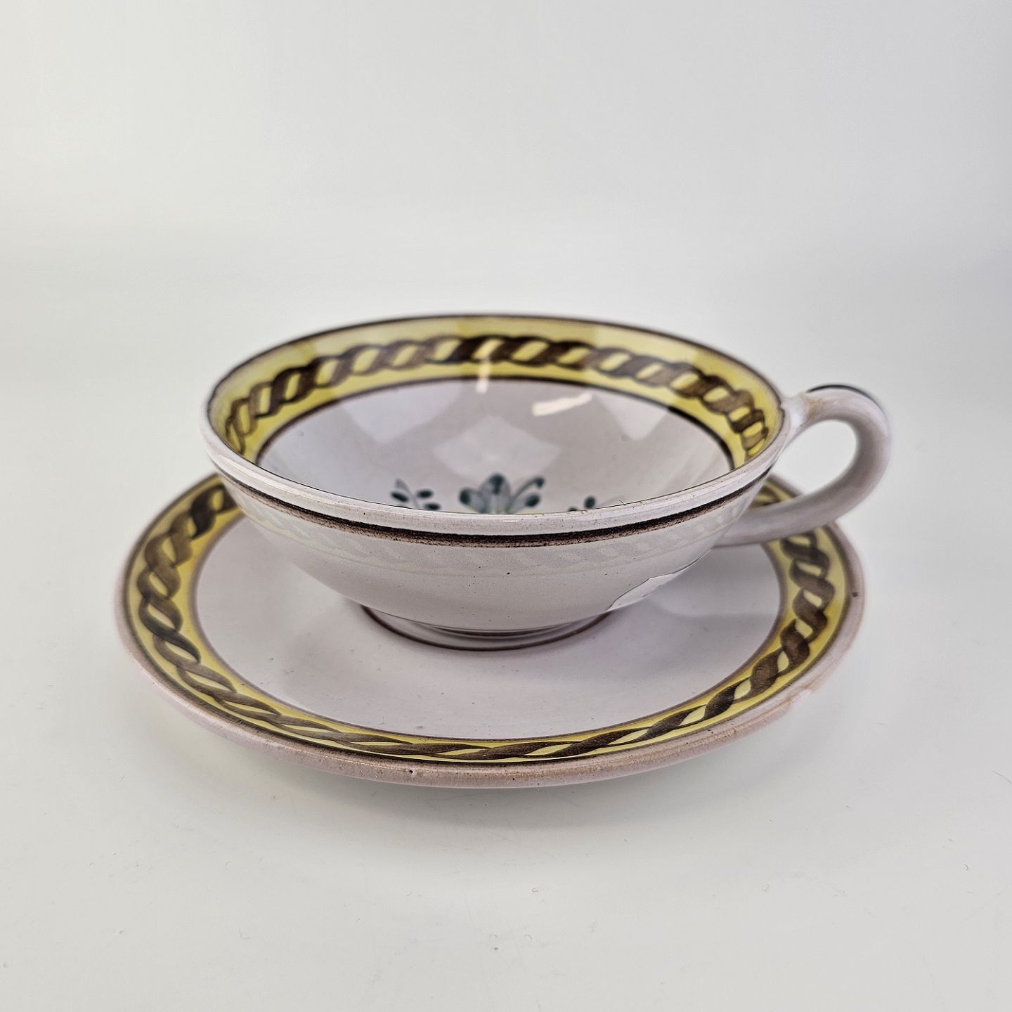 Beskrivelse: Kop og underkop i keramik med gule detaljer og blomsterdekoration