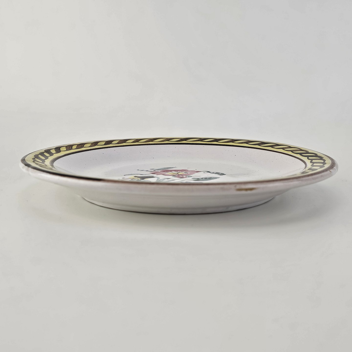 Beskrivelse: Desserttallerken i keramik med gule detaljer og blomsterdekoration