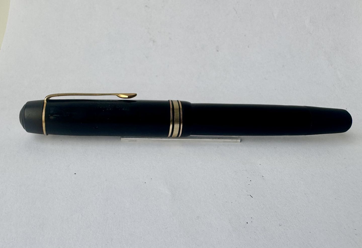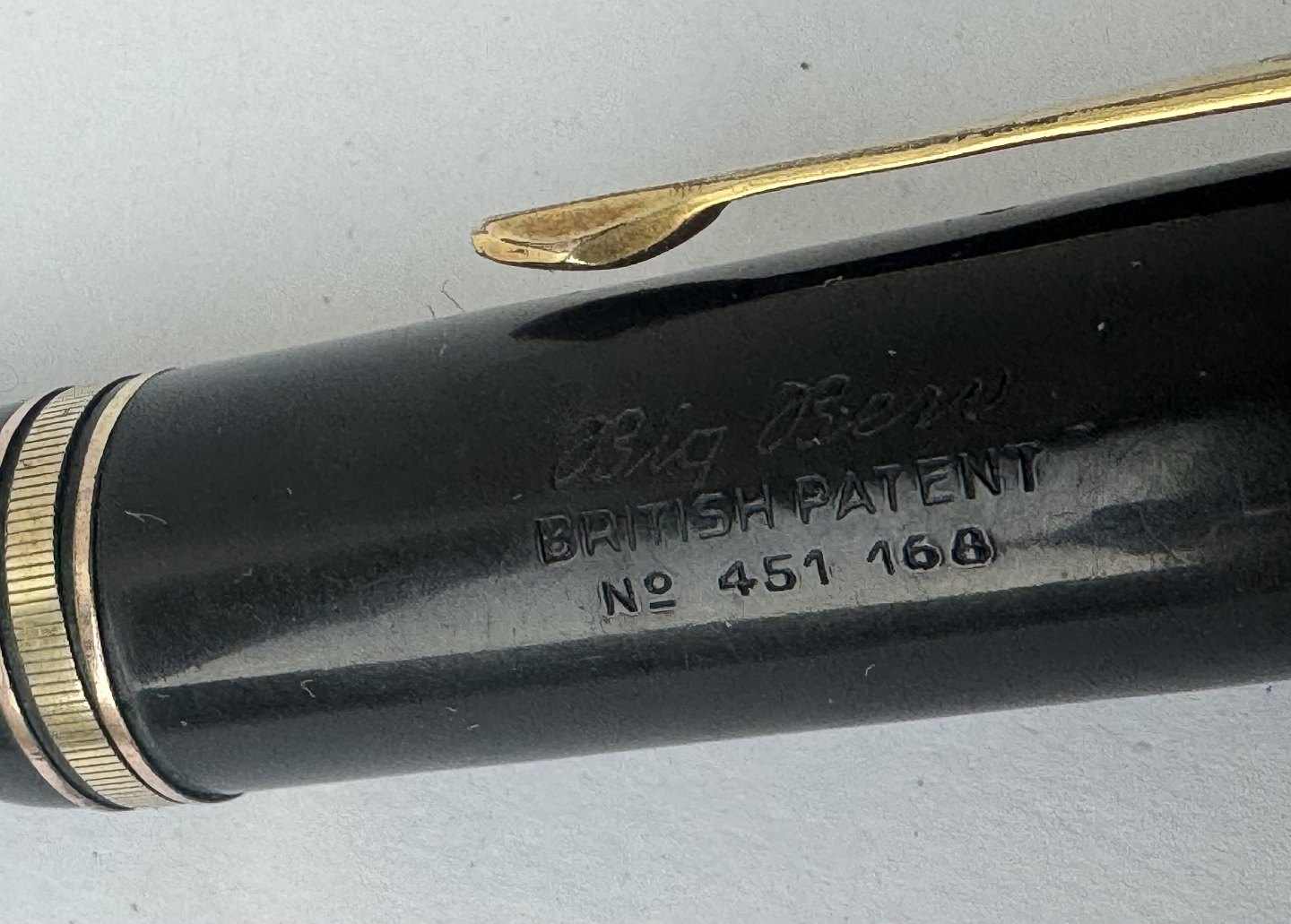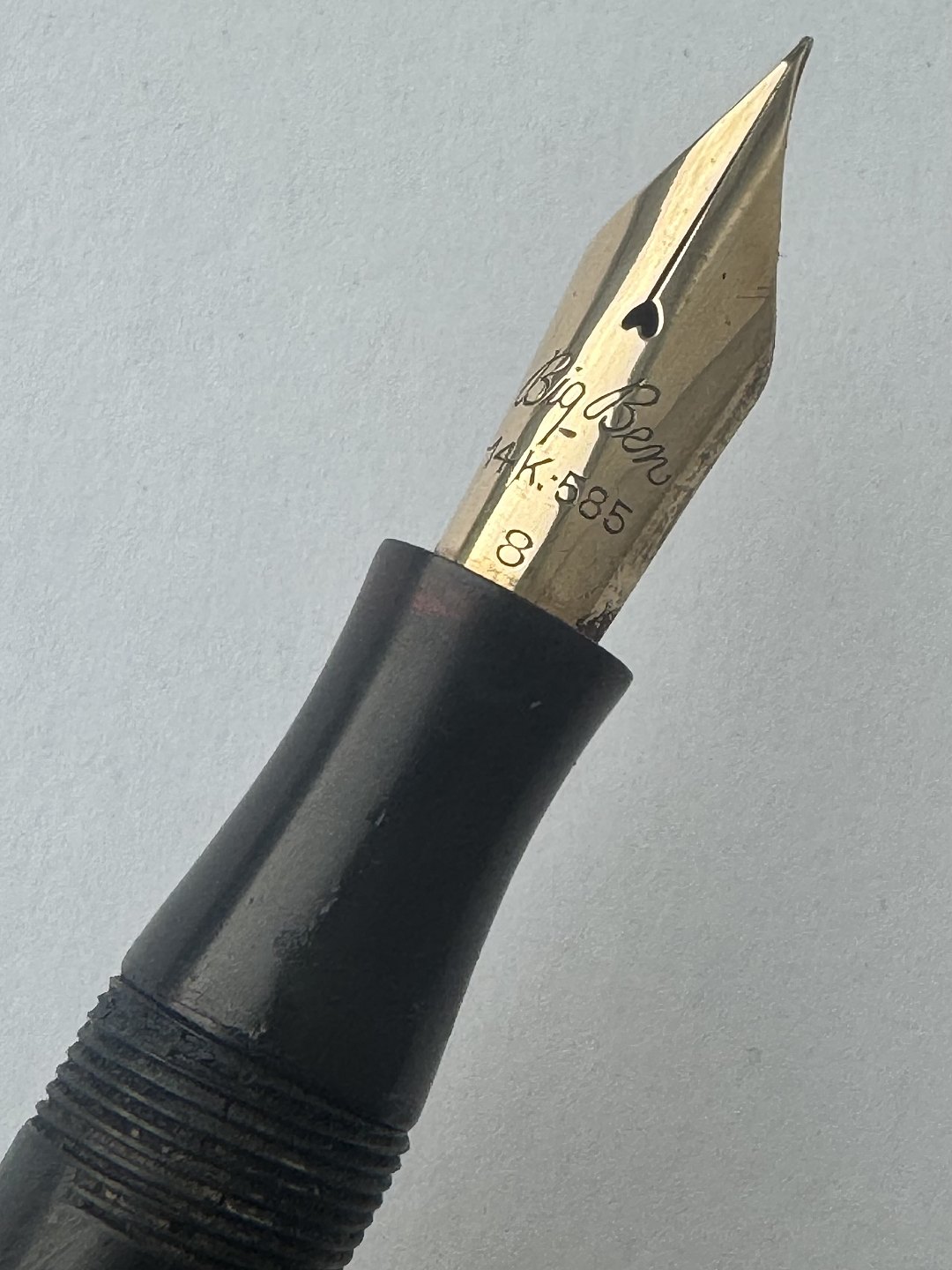 Beskrivelse: Stor sort Big Ben no. 8 fyldepen med push button filler. Fremstår i god stand uden skader eller reparationer. Alle dele originale BB dele inklusiv en kæmpe guldspids i 14 karat. Der skal indsættes ny gummisæk så pennen igen kan optage blæk og skrive igen. Fyldepennen måler 13,7 cm i længde og hættens åbningsdismeter er 1,3 cm.