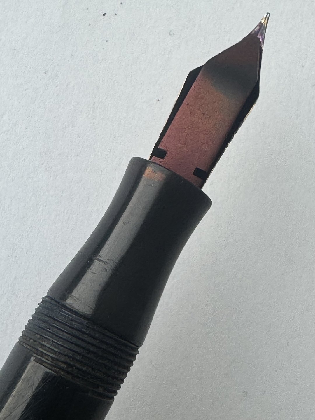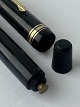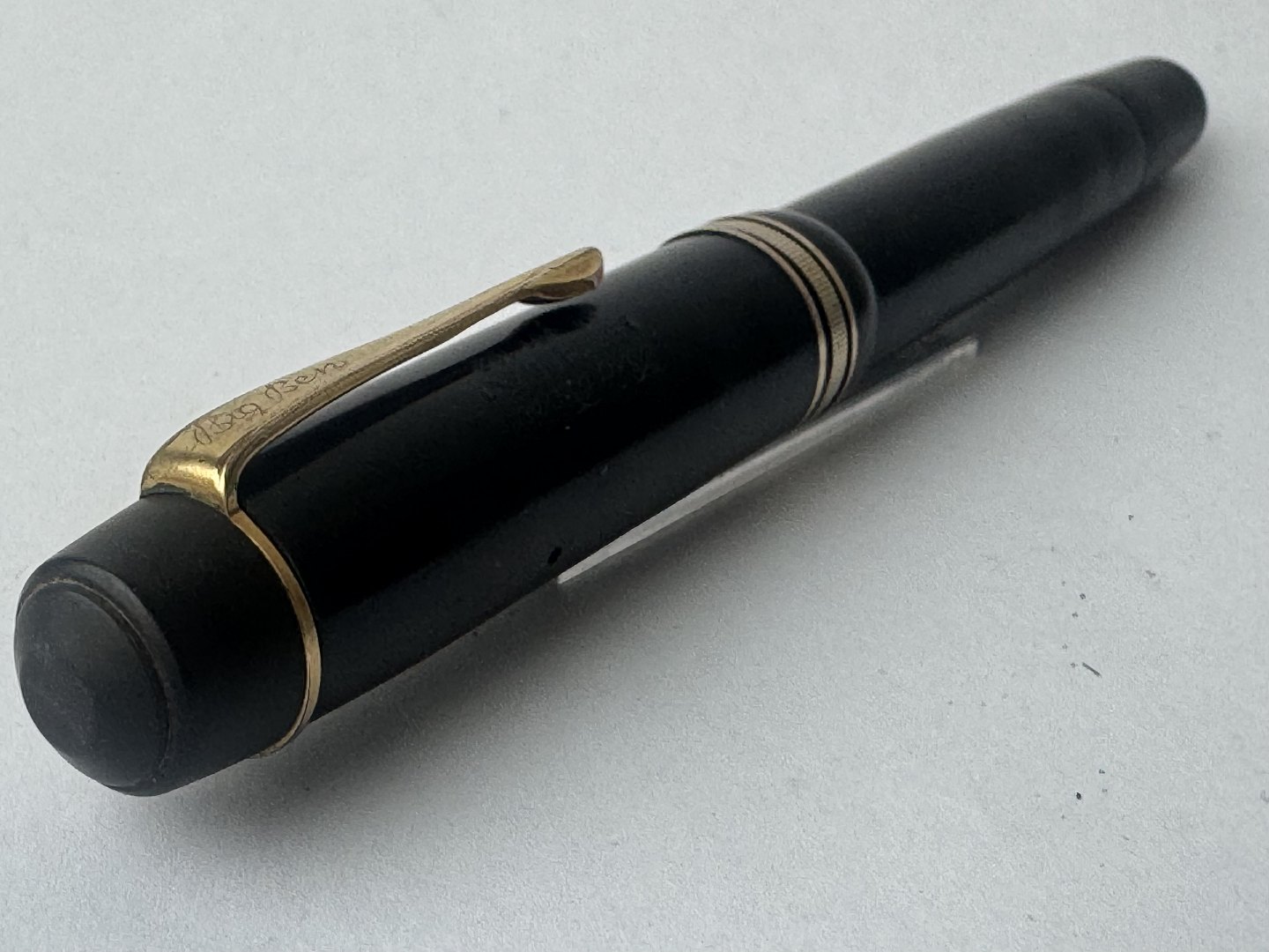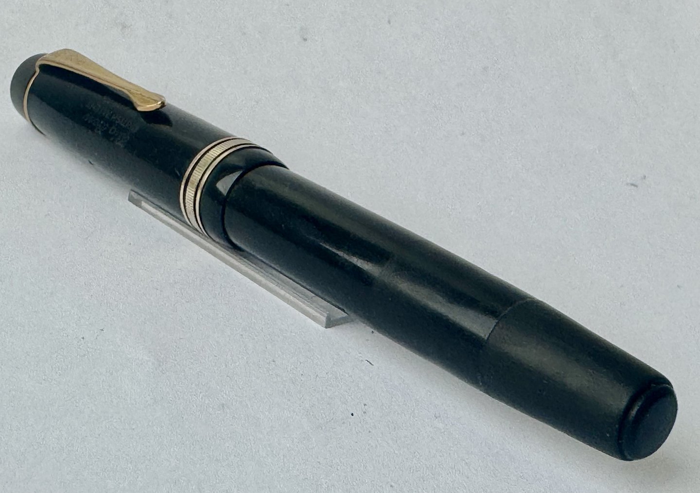 Beskrivelse: Stor sort Big Ben no. 8 fyldepen med push button filler. Fremstår i god stand uden skader eller reparationer. Alle dele originale BB dele inklusiv en kæmpe guldspids i 14 karat. Der skal indsættes ny gummisæk så pennen igen kan optage blæk og skrive igen. Fyldepennen måler 13,7 cm i længde og hættens åbningsdismeter er 1,3 cm.