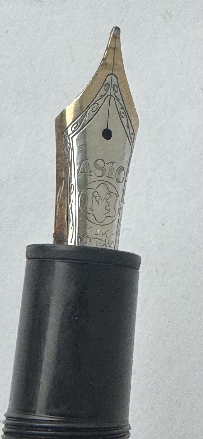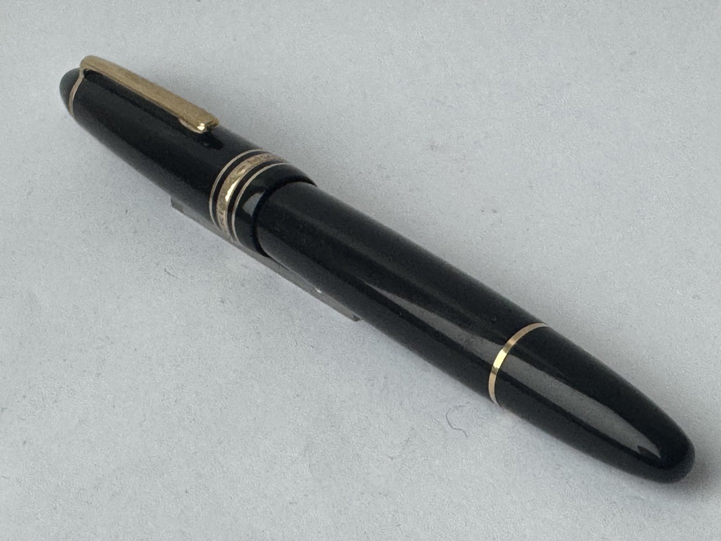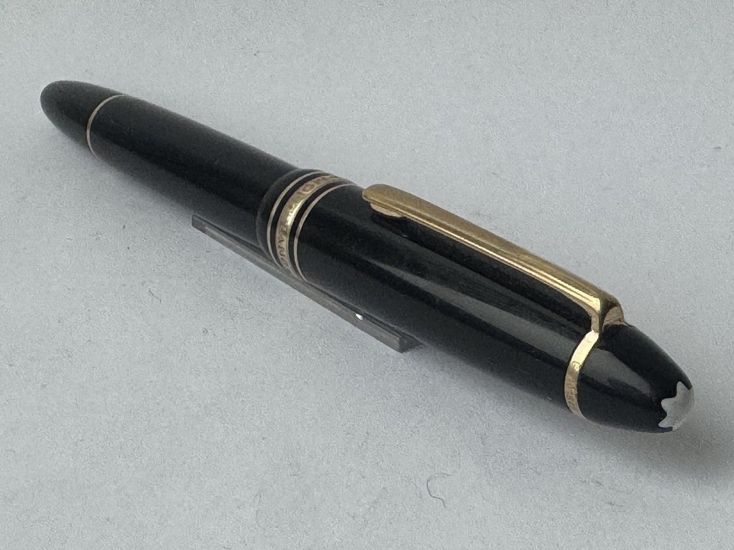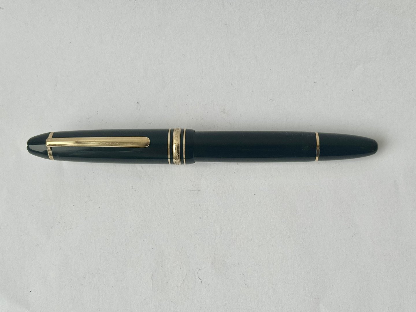 Beskrivelse: Sort Montblanc Meisterstück LeGrand fyldepen med alle originale Montblanc dele inklusiv en stor guldspids i 14 karat. Blækpåfyldning med piston filler. I god stand og klar til at blive brugt. L. 14,3 cm.