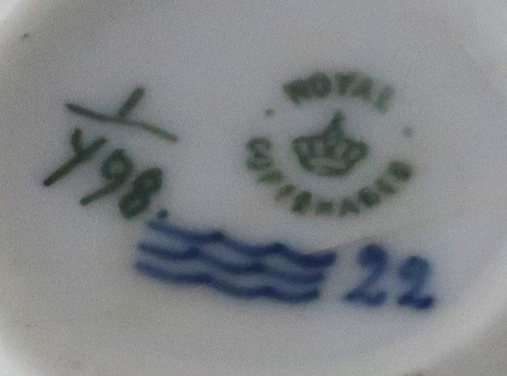 Beskrivelse: Royal Copenhagen. Musselmalet, riflet. Lille kuvertvase. Model 498. Højde 5,5 cm. (1 sortering). Produceret før 1923