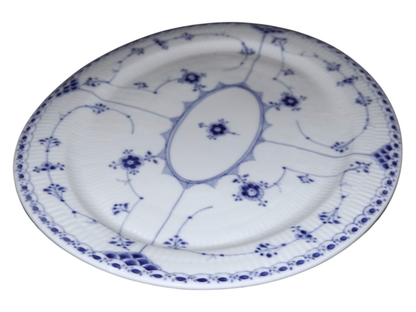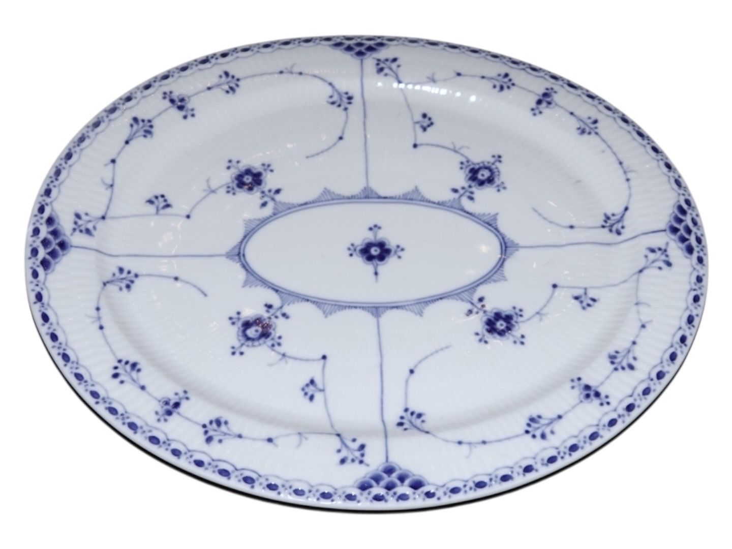 Beskrivelse: Royal Copenhagen Musselmalet Halvblonde, helfladt stegefad.