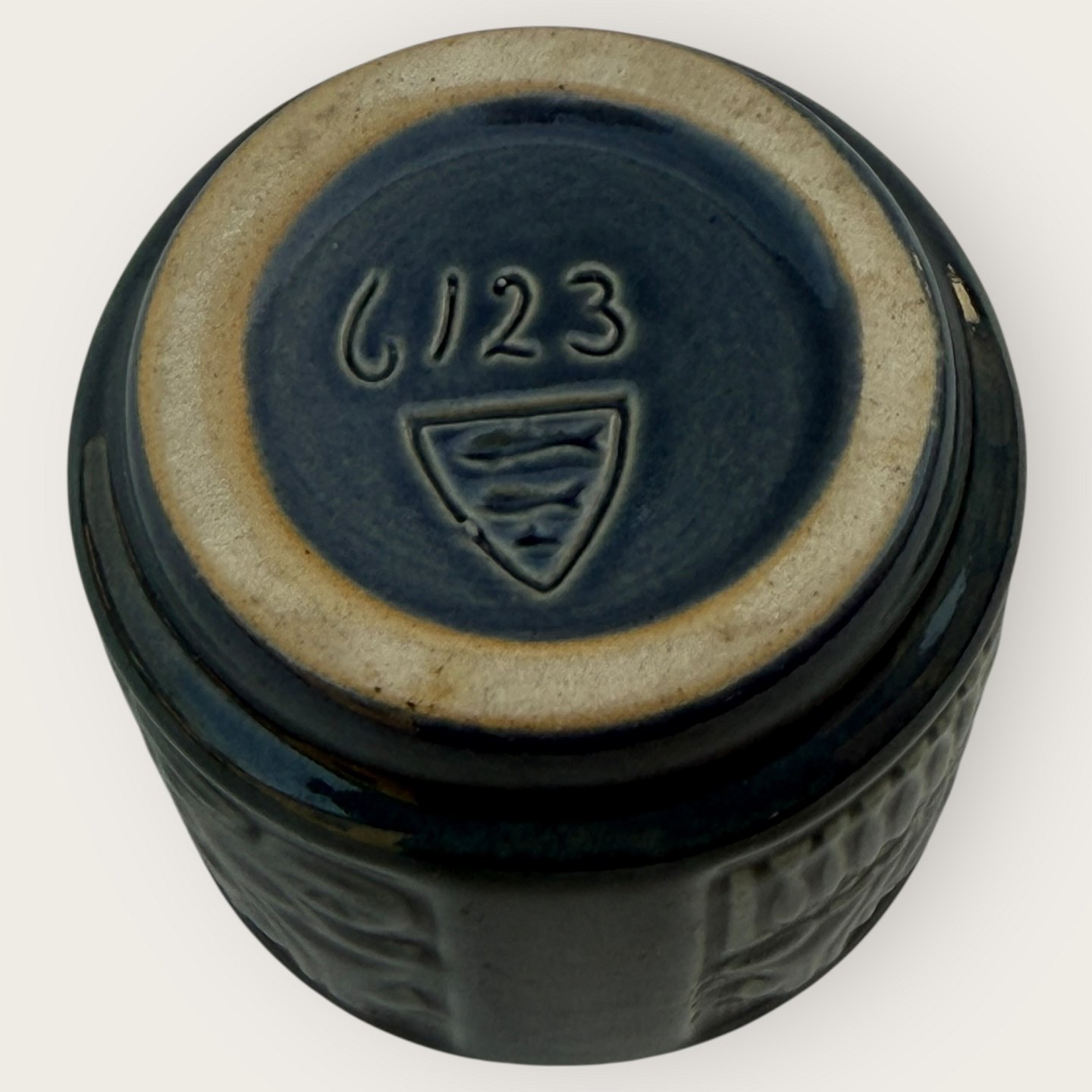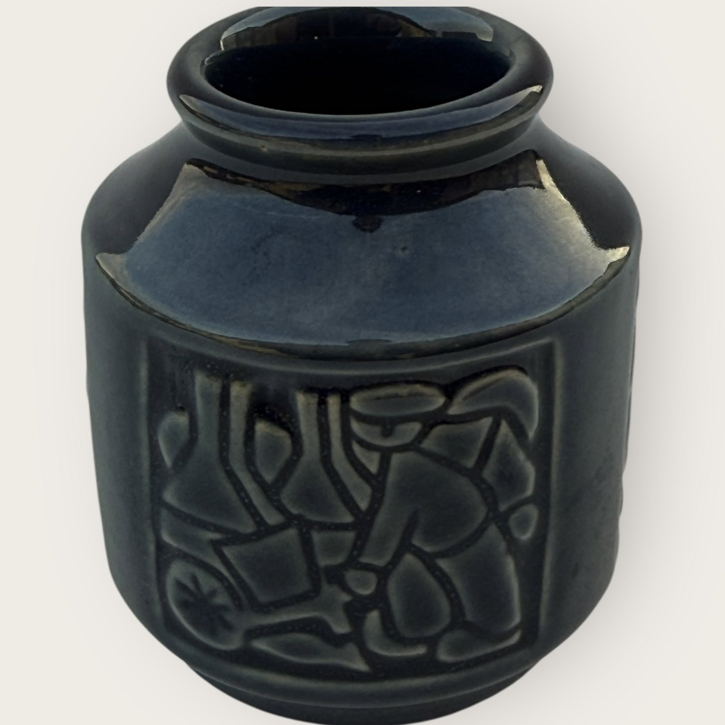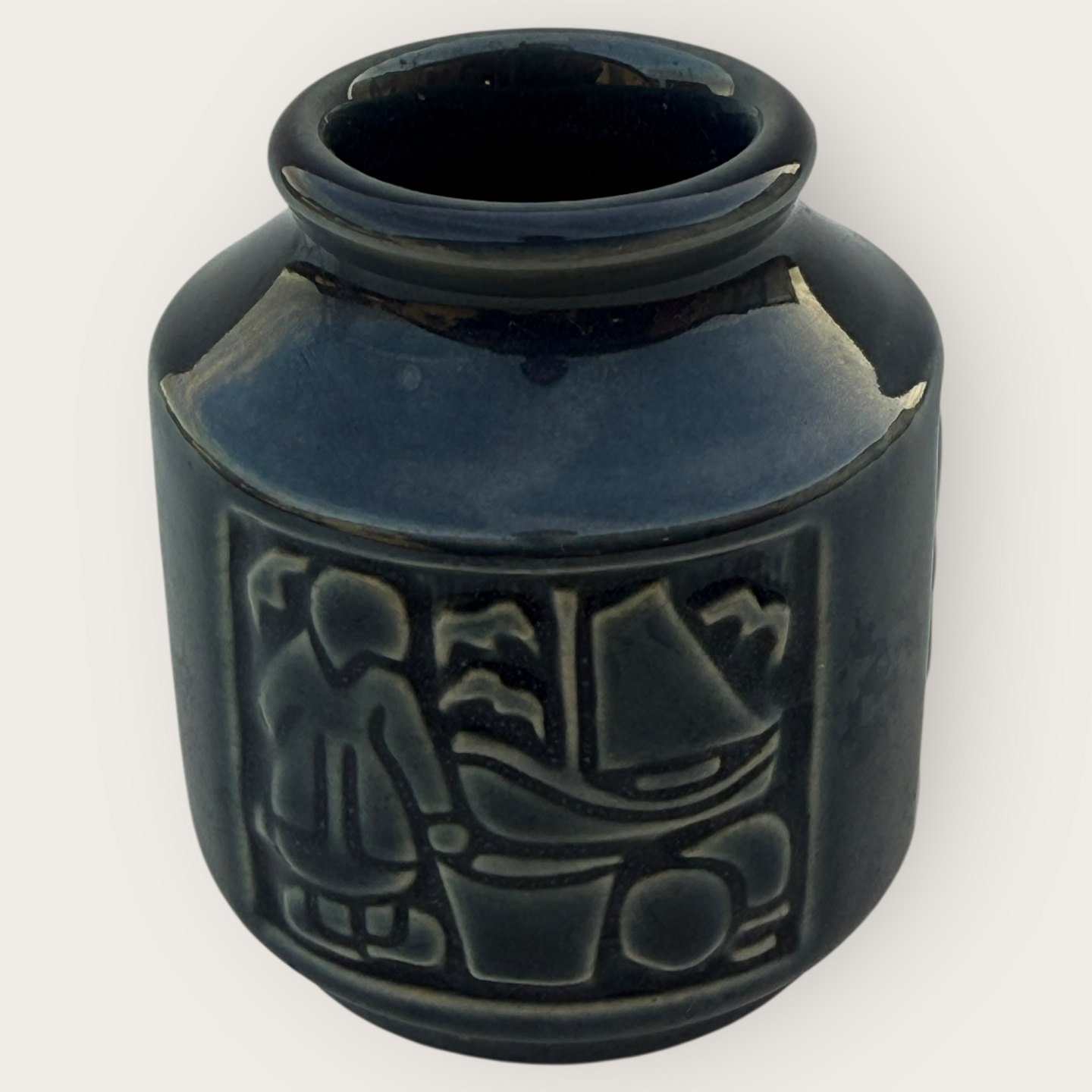 Beskrivelse: Bornholmsk keramik, Michael Andersen, Lille vasemed med motiver fra Bornholm, røgerier, fiskerkoner mv. Højde 8cm, diameter 6,5cm, #6123, fin stand.