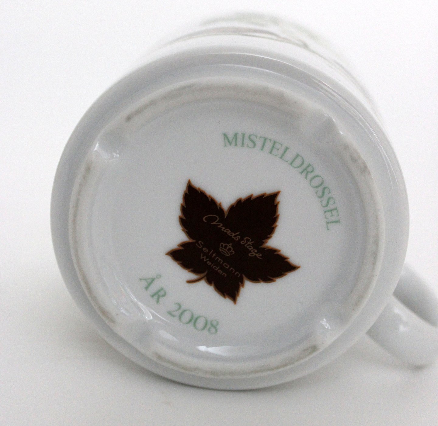 Beskrivelse: Mads Stage årskrus 2008. Misteldrossel. Højde 8,5 cm. Diameter 7,5 cm. Pris: 175 kr. stk. Lager: 1